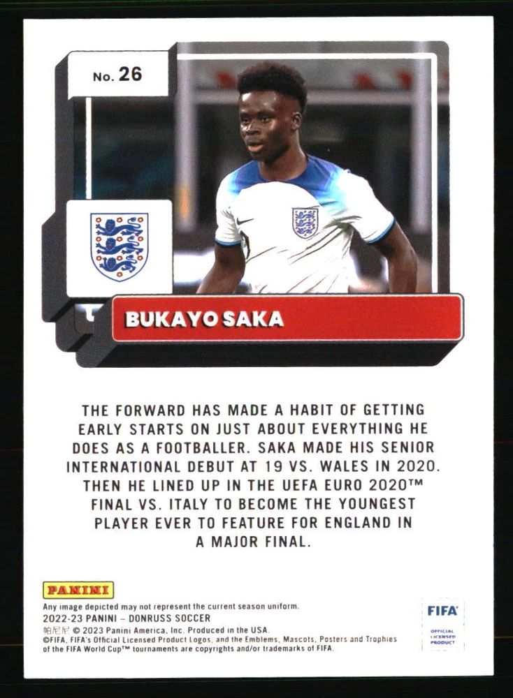 Year Manufactured: 2022 Team: England Season: 2022 Manufacturer: Donruss Set: 2022-23 Donruss Sport: SOCCER Player|Athlete: Bukayo Saka Graded: No Type: Sports Trading Card Autographed: No Card Number: 26