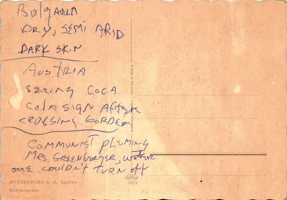 This postcard contains a mix of seemingly random words and phrases, including references to Bulgaria, Austria, a cola sign, crossing borders, communist plumbing, Rothenburg ob der Tauber, and a person named Mrs. Greenberger.