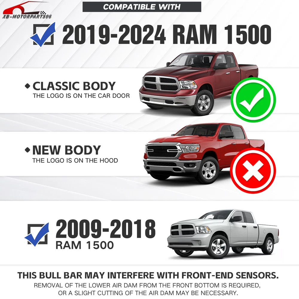 Bull Bar Front Grille Guard Bumper For 09-2018 Dodge Ram 1500 & 19-2024 Classic Please Note that this bull bar may interfere with front-end sensors. Suitable Models : Compatible with 2009-2018 Dodge Ram 1500 & 2019-2024 RAM 1500 Classic ( This won't fit 2019-UP RAM 1500 New Body Style & Rebel/Warlock/Sport Models ) Package Includes : 1 x Long Led Light Bars, 1 x Front Bull Bars, 1 x License Plate Frame Product Information : Product Dimensions : 37.4'' x 7.8'' x 19.7'' Installation mode: Bolt-On With Sensor Holes: No Placement on Vehicle: Front Item Weight: 30.14 Pounds Material: Carbon Steel Color: Black (hand measurements may have an error of 2-3 mm/0.078-0.118 in) Feature : ① Our grille guard comes with 312W long LED light bars and a license plate frame, providing additional lighting for night driving without the need for extra purchases. Our design features pre-drilled slots and holes, allowing for easy removal or replacement if desired; ② Our brush guards feature a special dual-side mesh design and an aggressive-looking logo on the Skid plate. The Skid plate is also removable, adding to the vehicle's wild appearance; ③ Constructed from square carbon steel with a black powder-coated surface, our Bumper Push Bar offers enhanced rust resistance and durability; ④ Direct bolt-on installation using factory holes. Removal of the lower air dam from the front bottom is required, or a slight cutting of the air dam may be necessary ; Warranty Period :2 year Standard Shipping (FedEx Ground or FedEx Home Delivery) Will usually ship within 3 business days of receiving cleared payment Please Note that this bull bar may interfere with front-end sensors. Suitable Models : Compatible with 2009-2018 Dodge Ram 1500 & 2019-2024 RAM 1500 Classic ( This won't fit 2019-UP RAM 1500 New Body Style & Rebel/Warlock/Sport Models ) Package Includes : 1 x Long Led Light Bars, 1 x Front Bull Bars, 1 x License Plate Frame Product Information : Product Dimensions : 37.4'' x 7.8'' x 19.7'' Installation mode: Bolt-On With Sensor Holes: No Placement on Vehicle: Front Item Weight: 30.14 Pounds Material: Carbon Steel Color: Black (hand measurements may have an error of 2-3 mm/0.078-0.118 in) Feature : ① Our grille guard comes with 312W long LED light bars and a license plate frame, providing additional lighting for night driving without the need for extra purchases. Our design features pre-drilled slots and holes, allowing for easy removal or replacement if desired; ② Our brush guards feature a special dual-side mesh design and an aggressive-looking logo on the Skid plate. The Skid plate is also removable, adding to the vehicle's wild appearance; ③ Constructed from square carbon steel with a black powder-coated surface, our Bumper Push Bar offers enhanced rust resistance and durability; ④ Direct bolt-on installation using factory holes. Removal of the lower air dam from the front bottom is required, or a slight cutting of the air dam may be necessary ; Warranty Period :2 year