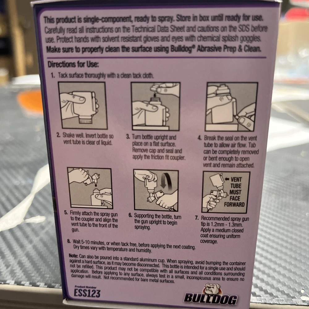 Introducing the Bulldog Single Shot Adhesion Promoter by Klean-Strip. This high-quality spray is perfect for those in the business and industrial sector looking for a reliable adhesion promoter. With a clear, fast-drying formula, it is suitable for use on plastic surfaces and comes in a convenient 5 oz container size. Ideal for industrial paints, coatings, and supplies, this product is a must-have for any professional looking to ensure a strong bond between surfaces. Its features include a spray application method and a colorless finish. Purchase now for a reliable solution to all your adhesion needs.