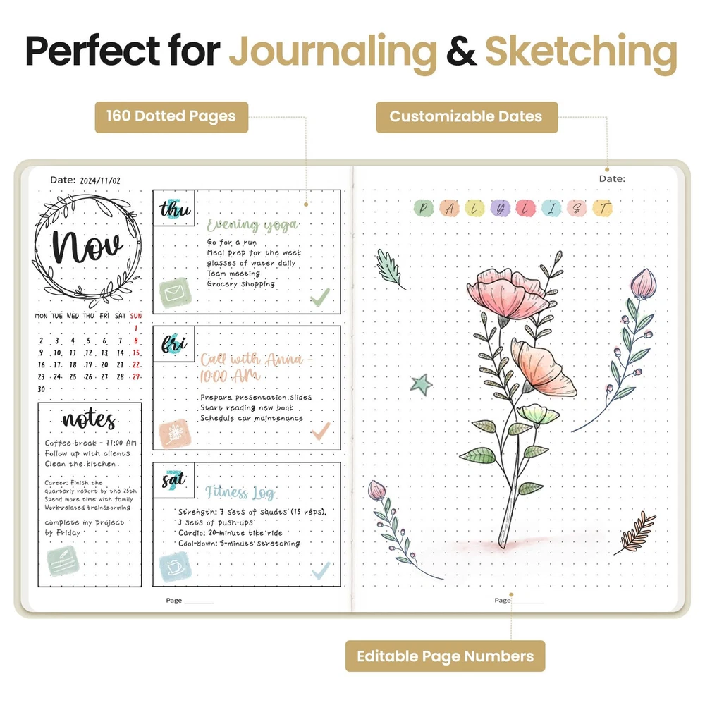 160 Pages Dotted Journal: Discover the freedom of 5mm-spaced dotted pages, perfect for bullet journaling, sketching, and organizing. The subtle dot grid provides structure without limiting creativity, helping you easily design layouts, track goals, and develop ideas in your personal style. Perfect for Creative Planning: Taja dotted journal is ideal for those who love crafting custom planners, creating mood boards, or organizing thoughts freely. It’s a versatile tool for artists, students, professionals, and anyone looking to visualize projects, tasks, and ideas with precision. Premium 100gsm Paper: Made with high-quality 100gsm paper, Taja harccover dotted journal offers a smooth, enjoyable writing experience with no ink bleed-through. Whether you're using pens, pencils, or markers, the durable paper ensures clean and crisp lines, preserving your work beautifully. Portable Size with Handy Extras: Sized at 5.7"x8.6", this medium A5 notebook is compact enough for easy carrying while still providing ample space for your creativity. The faux leather cover, expandable inner pocket, ribbon bookmark, and pen holder offer style and practicality for daily use. Lay-Flat Design for Seamless Writing: The 180° lay-flat binding makes it effortless for both left- and right-handed users to write, draw, or sketch without any interruptions. With a perfectly flat surface, this notebook enhances your creative flow on any surface.