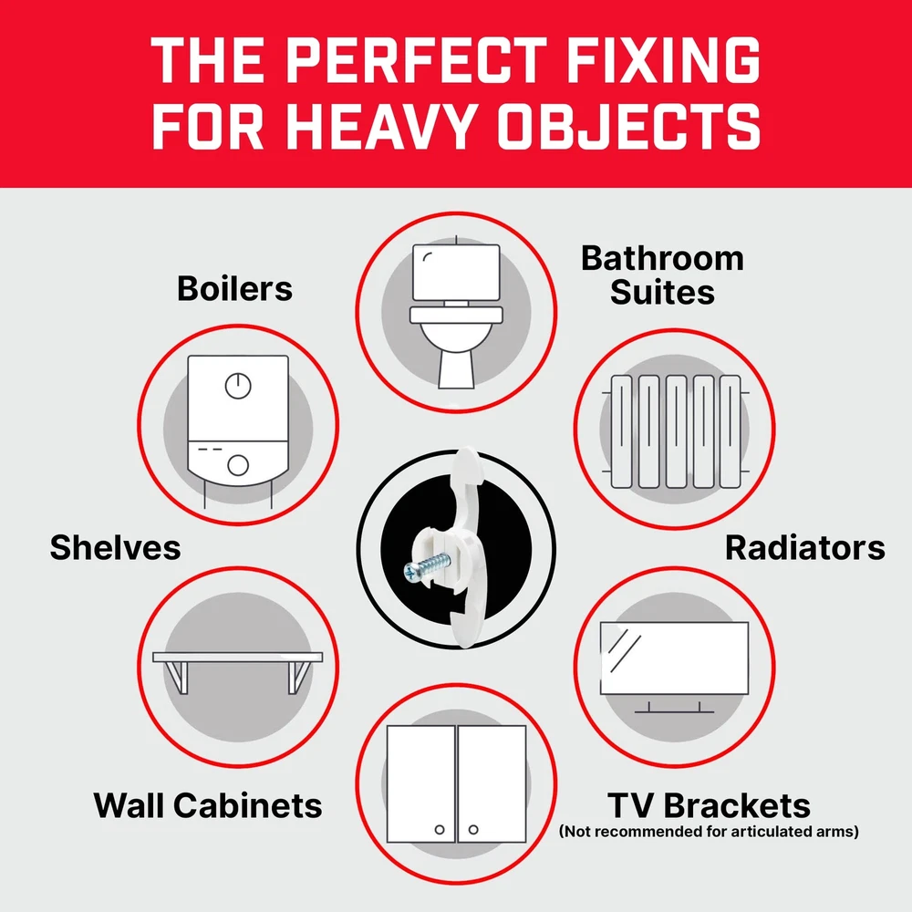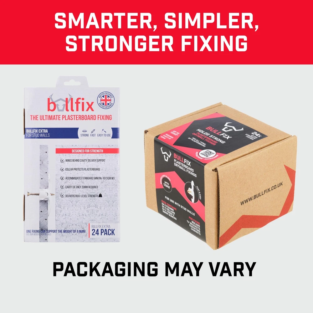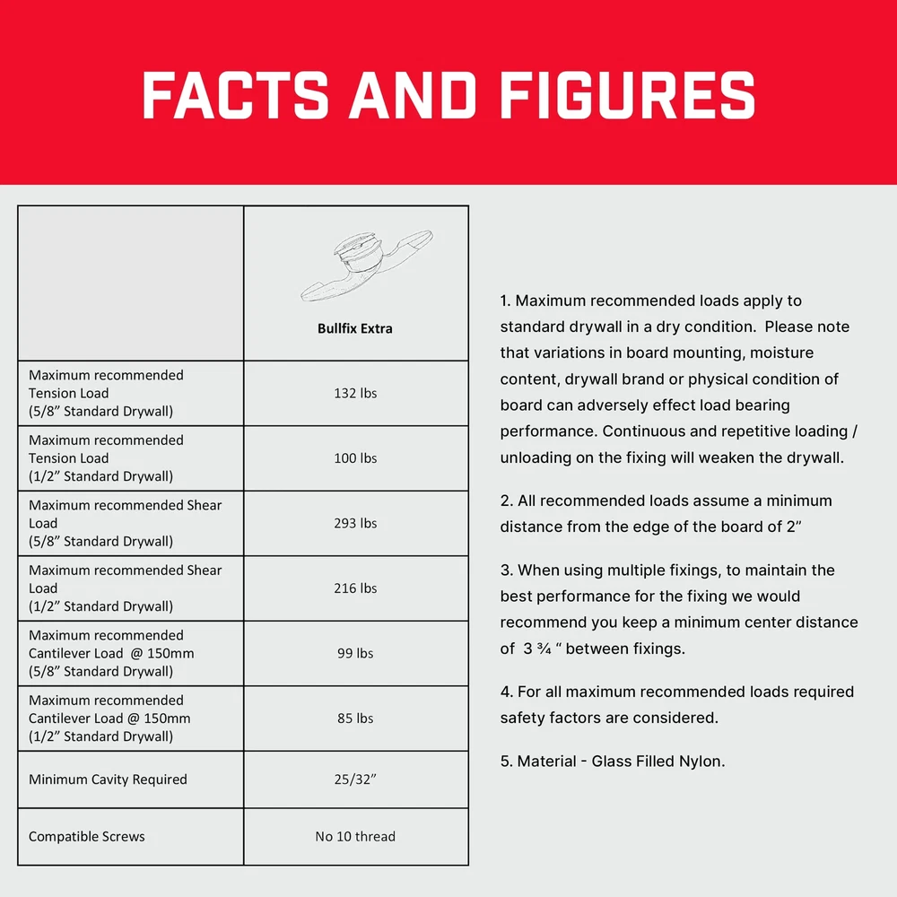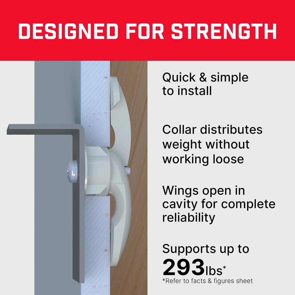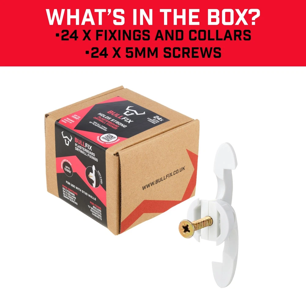 Strong and Reliable: Patented heavy duty drywall anchors hold up to 293lbs (see datasheet) on boards of standard thickness (1/2” - 5/8”). This dry wall anchors and screws kit contains 24 fixings with collars and No.10 x 13/16” screws Universal Use: These heavy duty wall anchors are versatile compared with other toggle anchors and can be used on any cavity drywall application type (A minimum cavity depth of 3/4” is required). Great for easy drywall repair jobs without any fuss Perfect for Hanging Heavy Objects: Secure and safe hang wall anchors designed for Sheetrock and other drywall, ideal mount for shelves, mirrors, radiators, bathroom and kitchen cupboards, and flat or tilted TVs. (Not recommended for cantilever, articulated or extendable arms) Dependable Wall Anchor: Unlike other toggle bolts or butterfly anchors, you'll never have to guess if a drywall anchor has opened properly again! Thanks to the intuitive design, you cannot screw into a Bullfix fixing if the wings haven’t fully opened Easy-to-Use Hollow Wall Anchors for Drywall: Quick and easy fastener to install by following 5 simple steps, you can reliably secure any heavy items to drywall