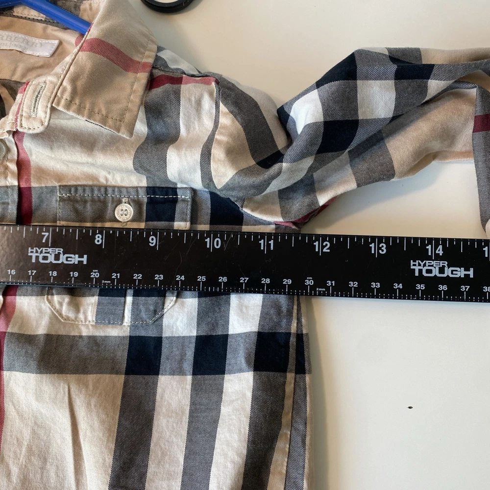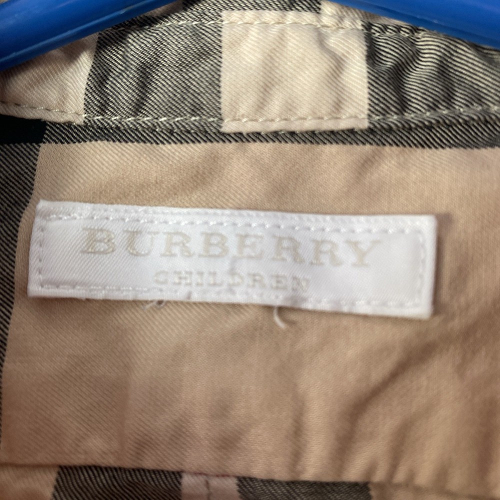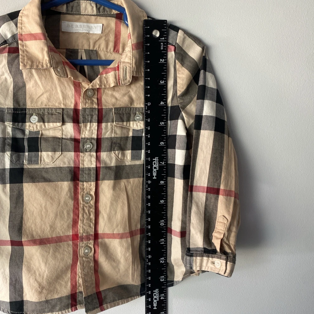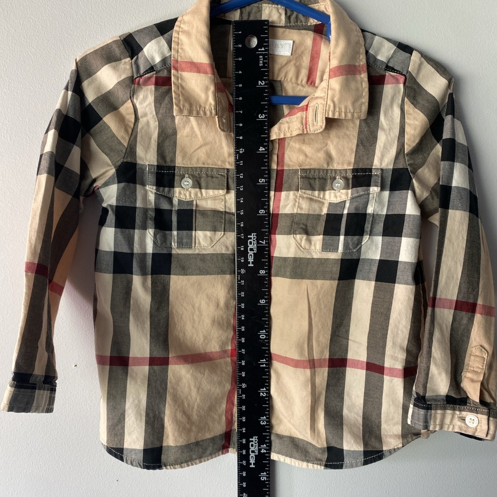 This Burberry toddler boys' shirt in size 2T features a tan long-sleeve design with a Nova check plaid pattern, made from 100% cotton for a comfortable fit. The collared neck with a button closure and regular fit make it a versatile option for various occasions such as travel, casual outings, parties, and more. The beige color and classic Burberry brand add a touch of sophistication to the overall preppy style. Perfect for all seasons, this button-up shirt is a timeless addition to any young boy's wardrobe.
