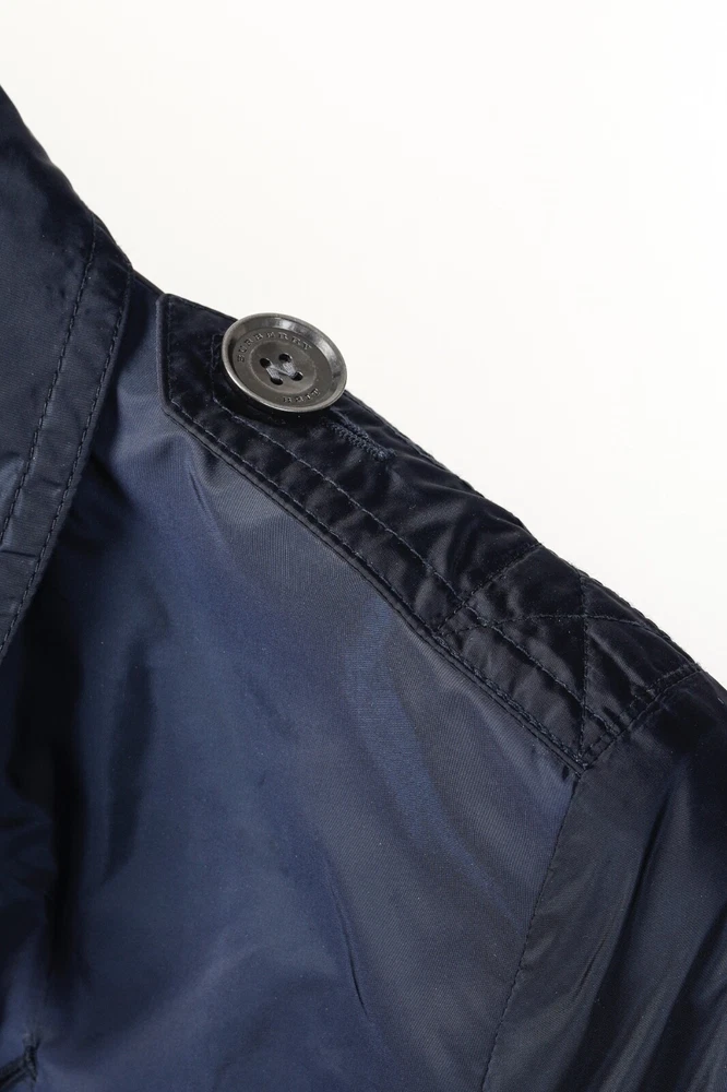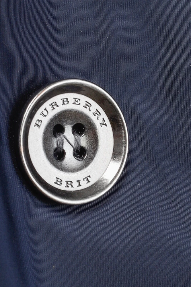 This rain coat from Burberry Brit is crafted in navy blue nylon, and features long sleeves, button-closure tabs on the cuffs, shoulder epaulettes, a collared neckline with an oversized hook closure and button-closure throat latch, double-breasted button closures, grommets for venting on the underarms, a self-belt, front button-closure pockets, a back vent, and is partially lined in a blue check synthetic on the bodice, and a tonal satin on the sleeves. Size: US 8 (M) Condition: Great; light marking on right chest, near left armhole, and front right hem Approximate Measurements (laid flat): Shoulder: 15" (38 cm) Chest: 19.5" (49.5 cm) Waist: 18.25" (46 cm) Length from back: 28.5" (72 cm) Sleeve length: 25" (63.5 cm) Composition: Outer/main fabric: 100% polyamide (nylon). Upper body lining: 100% polyester. Sleeve lining: 100% cupro. Undercollar: 100% cotton.