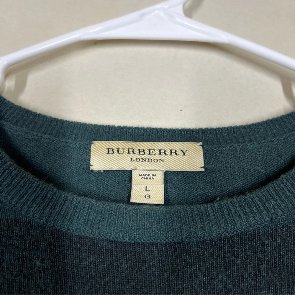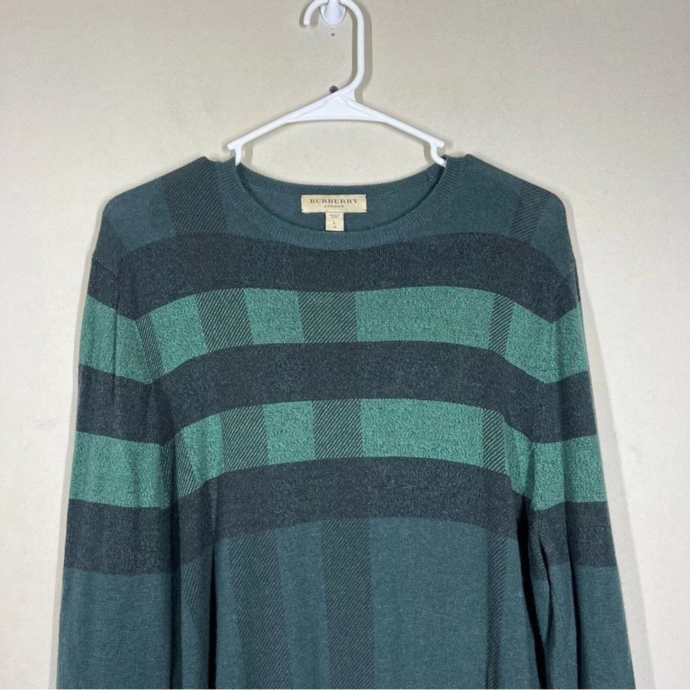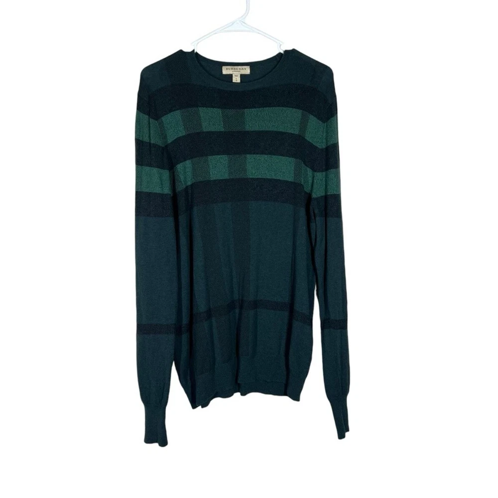 Burberry London Wool/Cashmere/Silk Blend Plaid Sweater Size Large Color: Green Wool, Cashmere, & Silk Blend Long sleeve Lightweight Crewneck No rips holes or stains Approximate measurements laying flat Chest 20.5” Length 29”