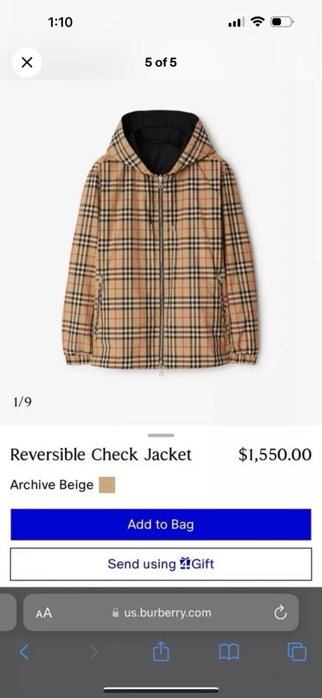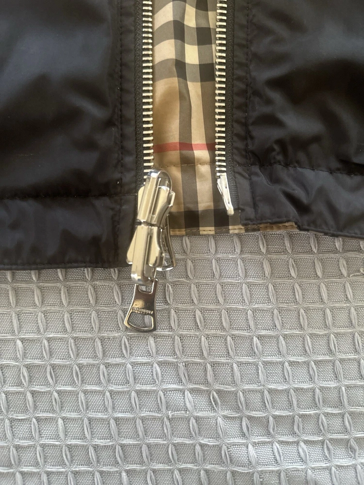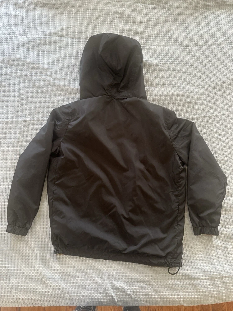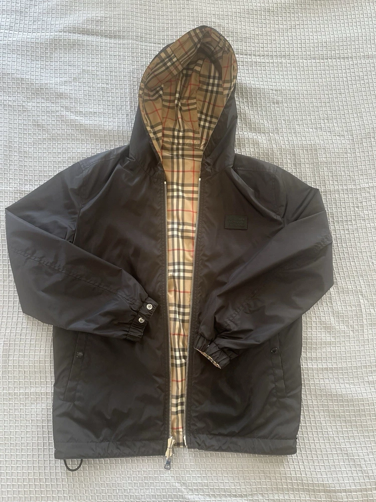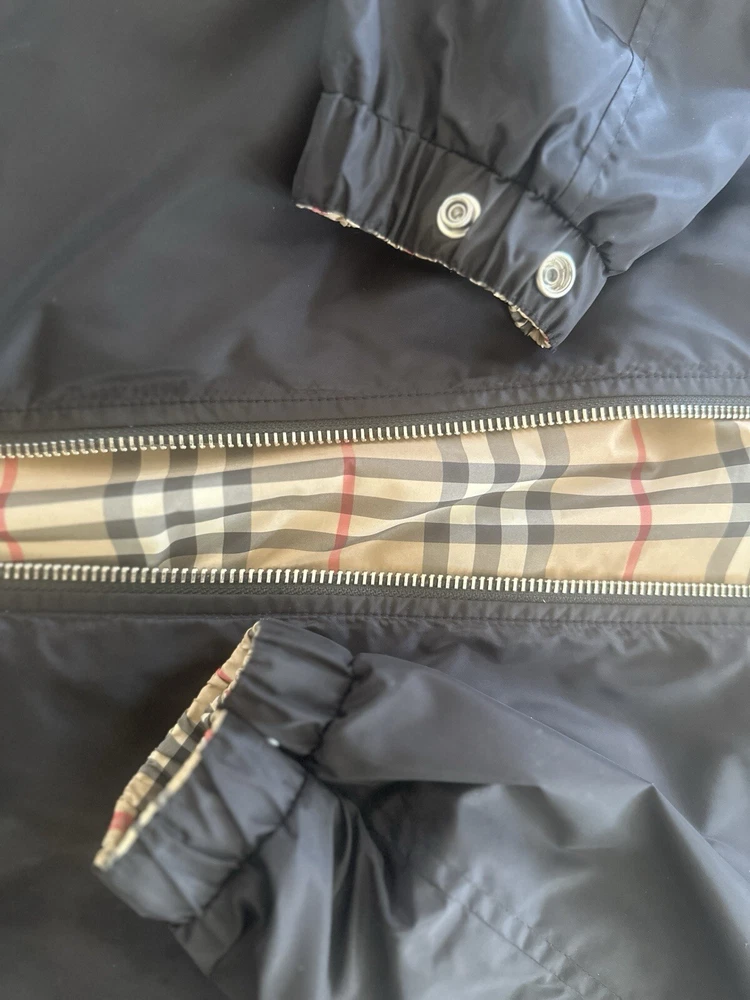 Elevate your style with this Burberry Reversible Check Hooded Windbreaker. Made with a polyester outer shell material, this jacket is perfect for any occasion. The beige color and check pattern give it a classic look, while the hood and reversible feature add practicality and versatility. This windbreaker is designed for men in a regular size L, and is a great addition to any wardrobe. The jacket's features include a hood, reversible design, and a windbreaker style, making it perfect for any weather conditions. Don't miss out on this stylish and functional jacket. Excellent condition. Only worn a few times.