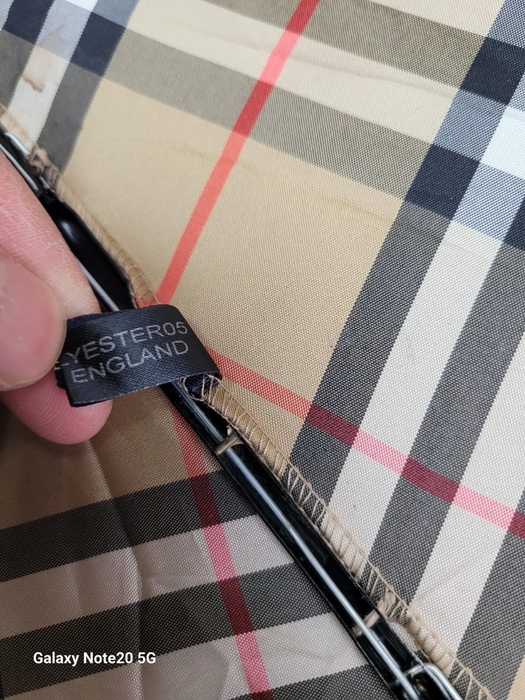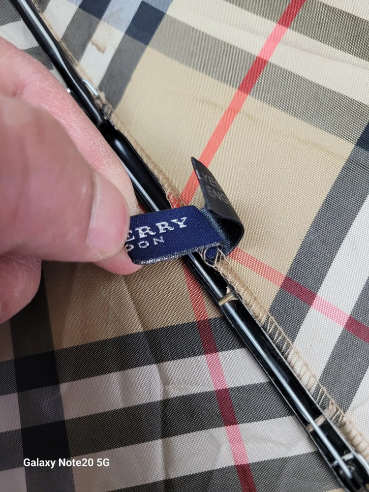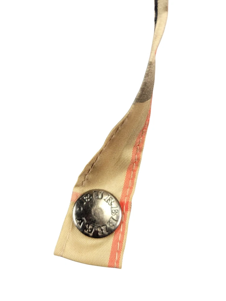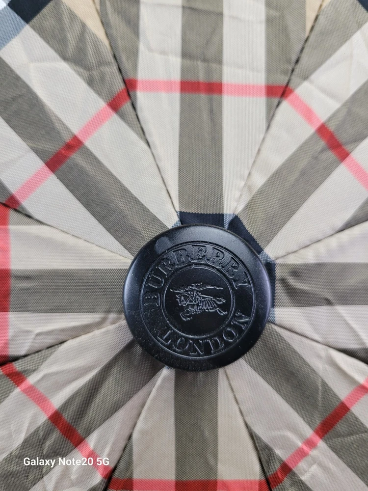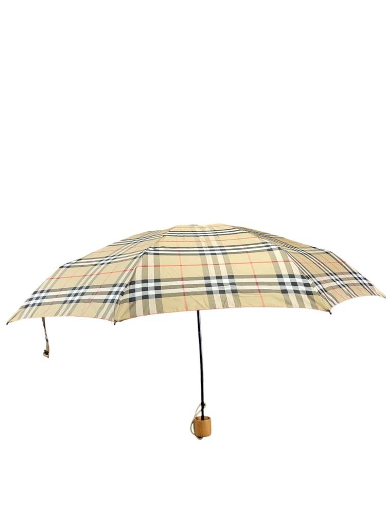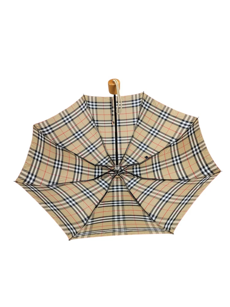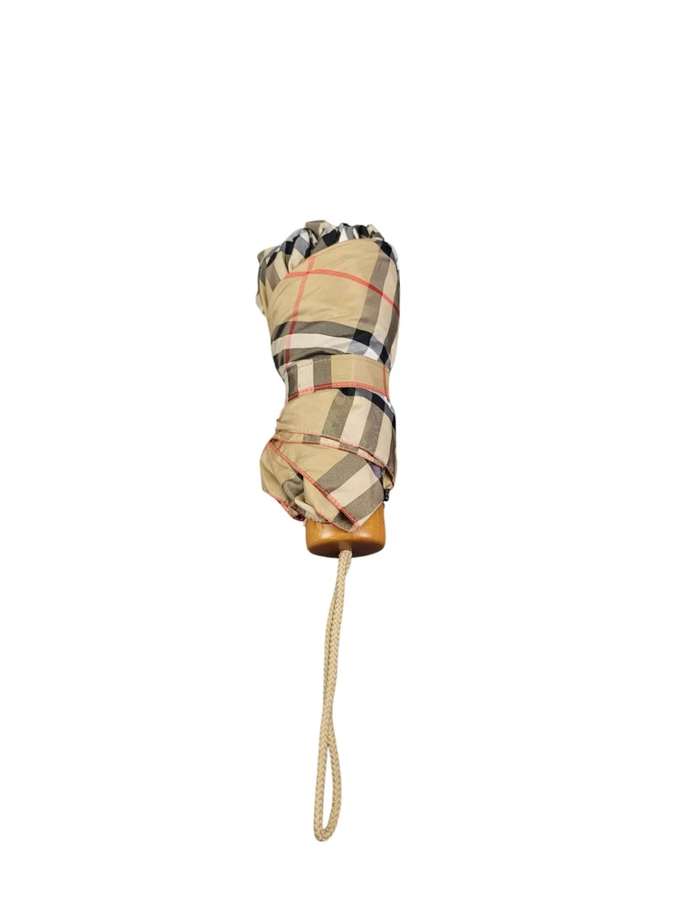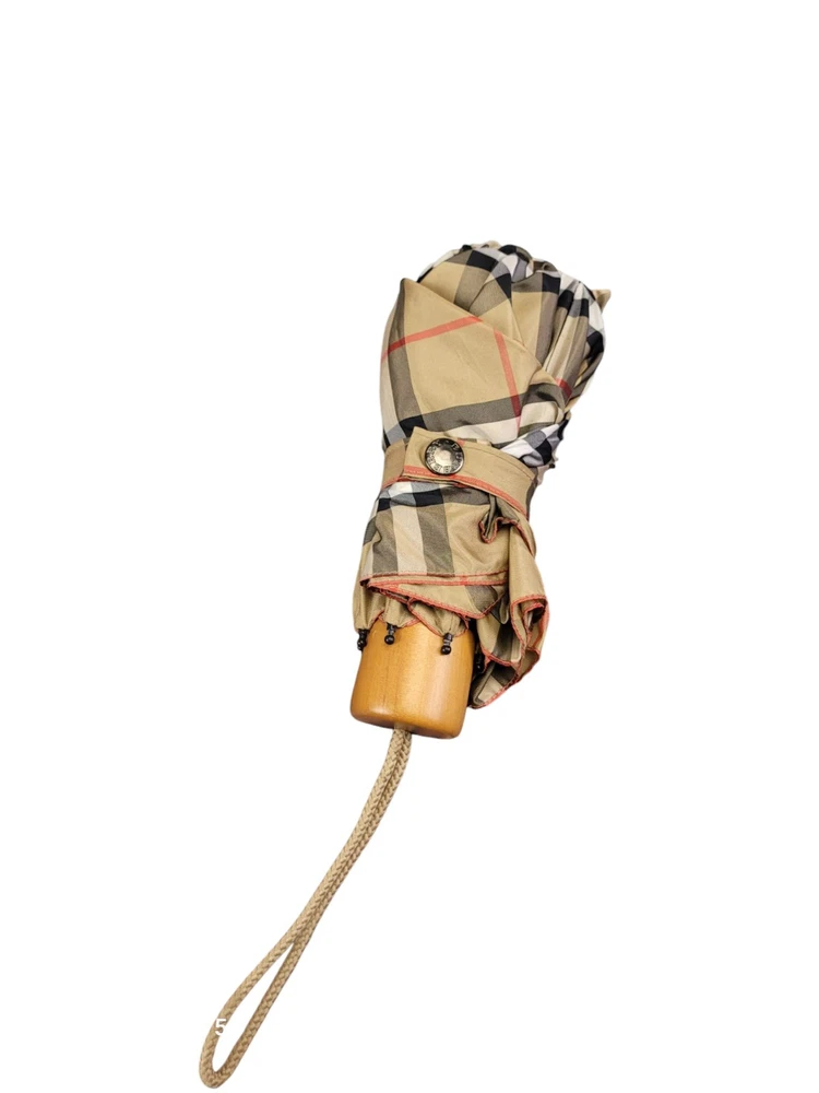 This Burberry umbrella features the iconic Nova Check plaid pattern in a classic beige color, making it a stylish accessory for women. The compact/folding design and automatic feature provide convenience for on-the-go use. Made of durable nylon with wooden accents, this umbrella exudes quality and sophistication. Perfect for staying dry in style during rainy days, this unisex umbrella showcases the Burberry logo subtly on the accents.