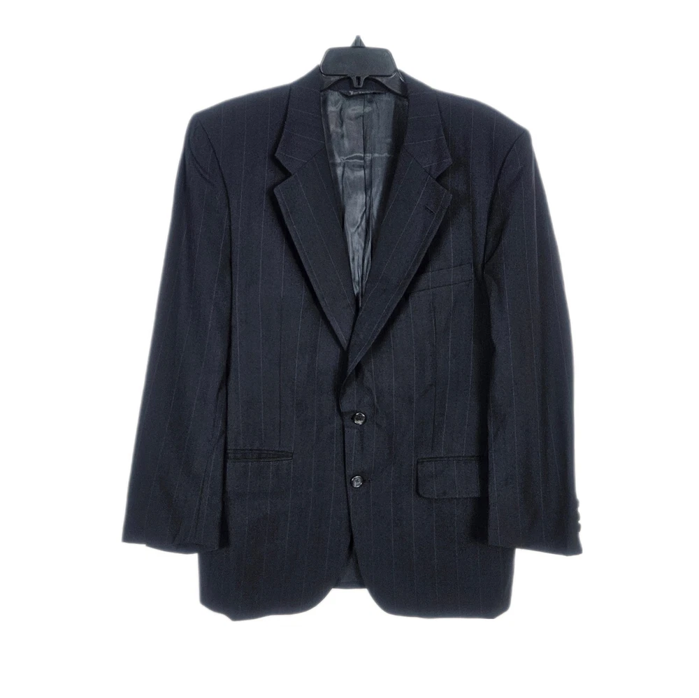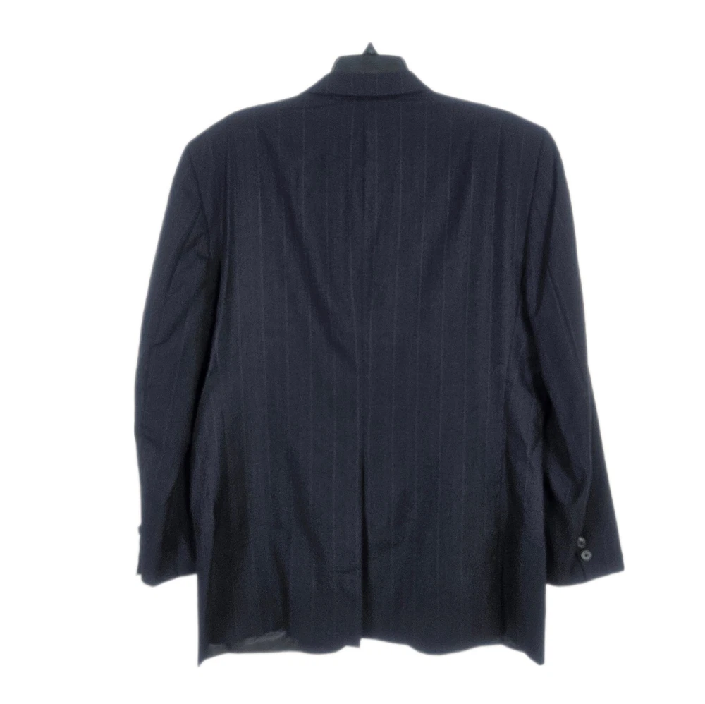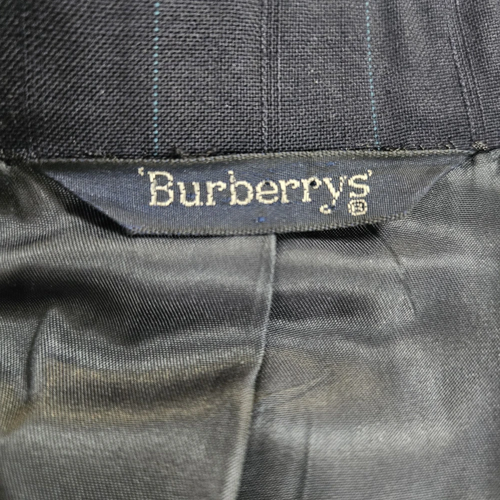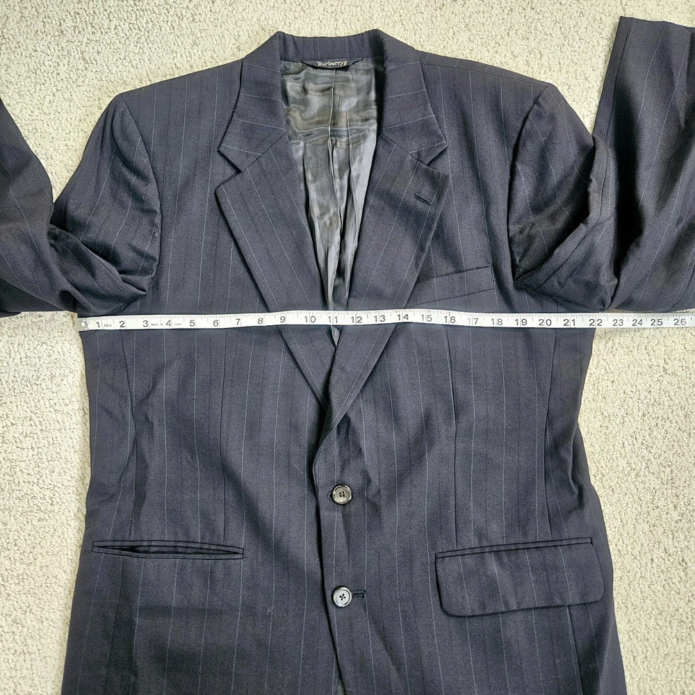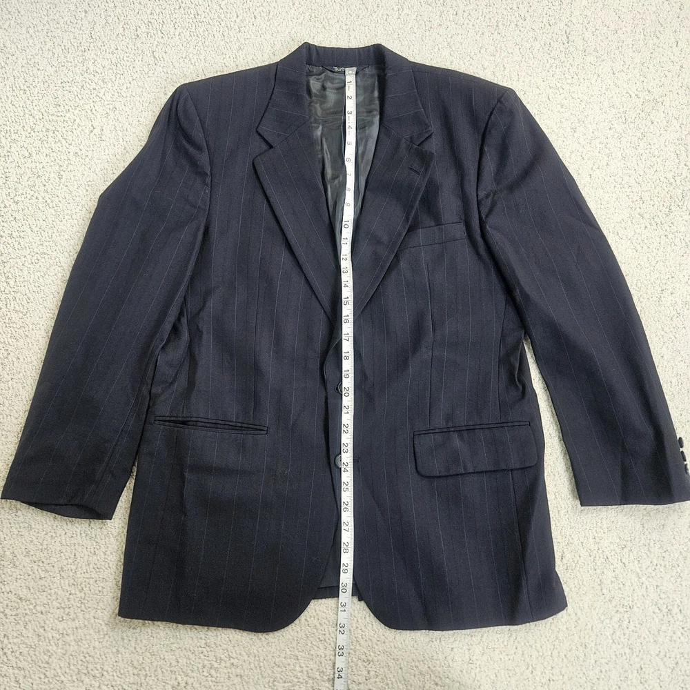 Vintage Burberry navy blue striped sport coat/ blazer/ suit jacket. Material is 100% pure wool, union made in USA. Notched lapel, two button closure, single vent. Size 44 Long, based on measurements as size tag is not marked. Jacket's "Burberrys'" tag dates it to the 90s, as the company dropped the "s" from their name in 1999. *Please verify measurements before purchasing * Good preowned condition