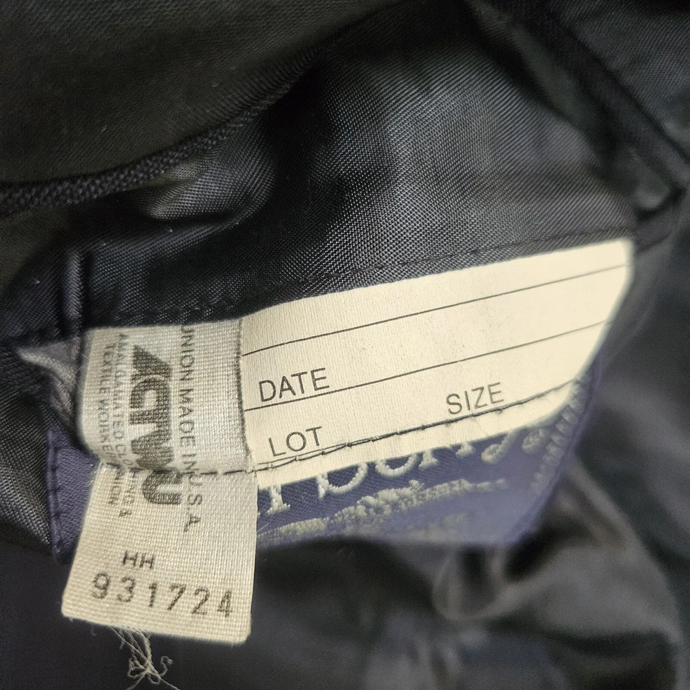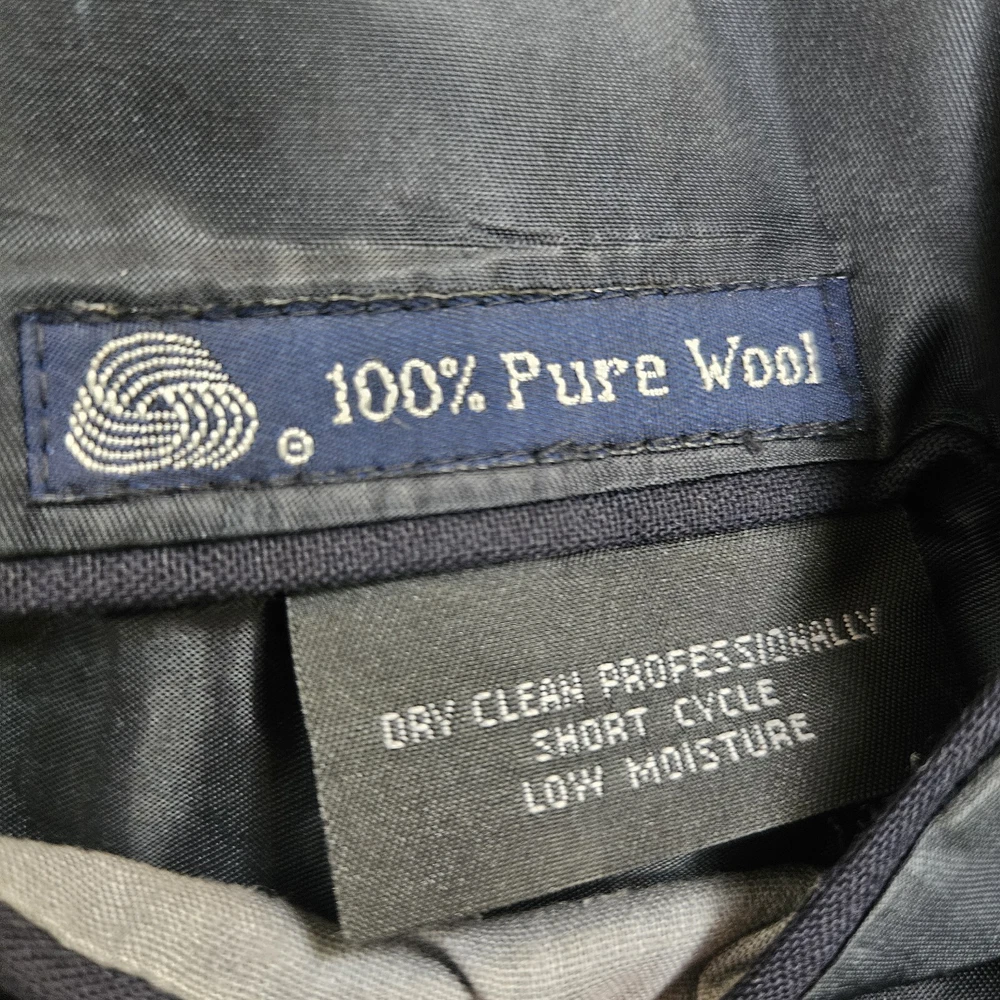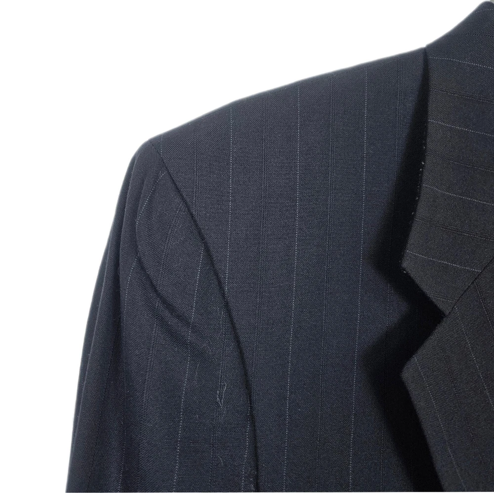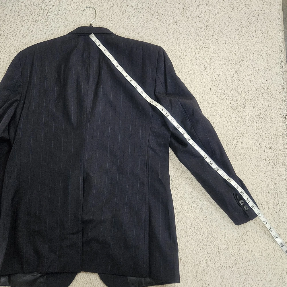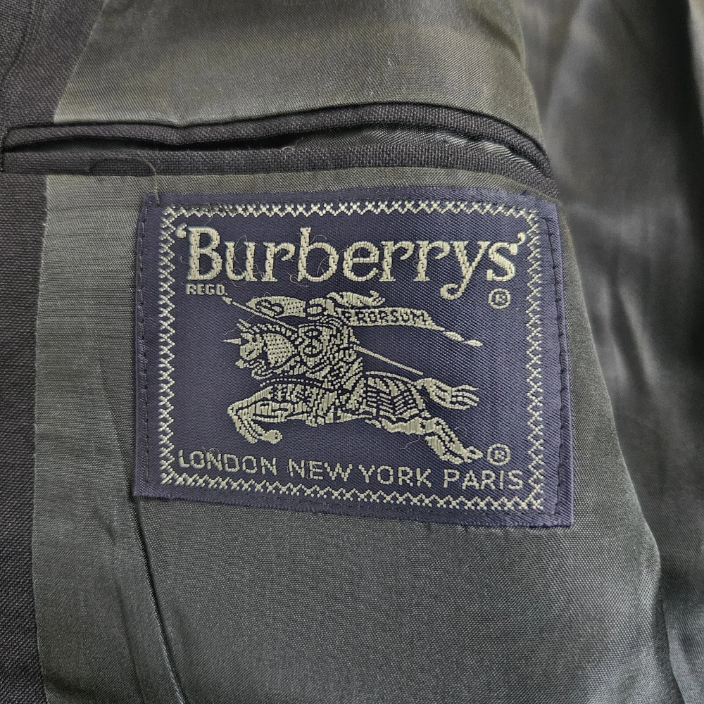 Vintage Burberry navy blue striped sport coat/ blazer/ suit jacket. Material is 100% pure wool, union made in USA. Notched lapel, two button closure, single vent. Size 44 Long, based on measurements as size tag is not marked. Jacket's "Burberrys'" tag dates it to the 90s, as the company dropped the "s" from their name in 1999. *Please verify measurements before purchasing * Good preowned condition