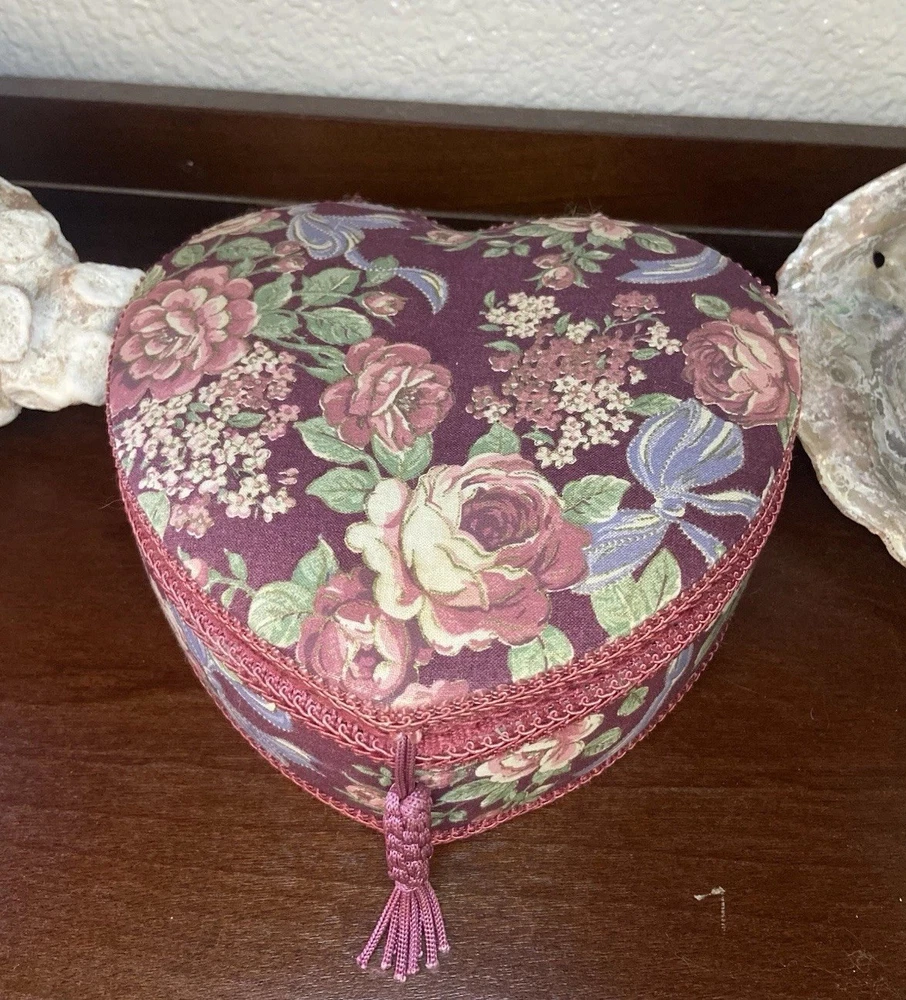 This Burgundy Heart Shaped Jewelry Or Sewing Box is a charming and stylish accessory for any room. The intricate floral detailing on the fabric material adds a touch of romance, making it perfect for all occasions. The heart shape and red color of the box give it a feminine and elegant look, while the ribbon detailing adds a sweet finishing touch. This original piece from the Keepsake Boxes collection is a unique and charming addition to any adult's collection.