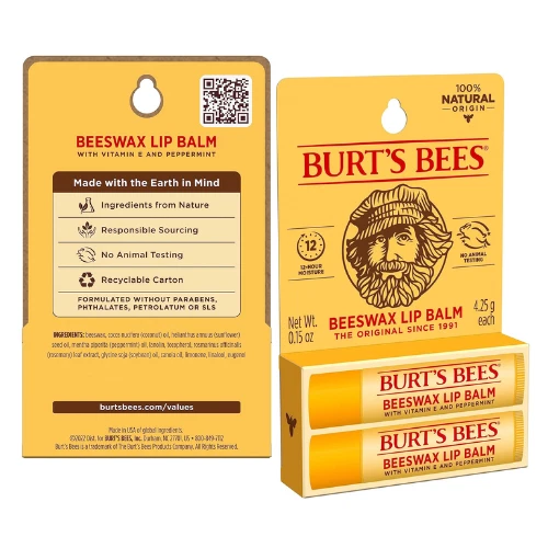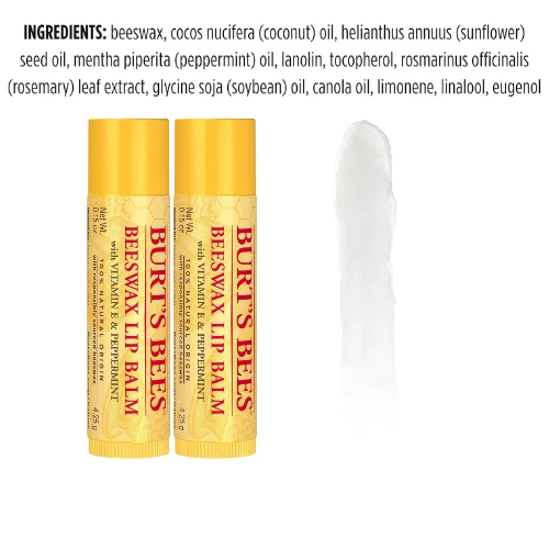 Burt's Bees Lip Balm - Original Beeswax, Lip Moisturizer With Responsibly Sourced Beeswax, Tint-Free, Natural Origin Conditioning Treatment, 2 Tubes, 0.15 oz. EASTER BASKET STUFFERS: Bursting with minty freshness, this Burt's Bees Beeswax Moisturizing Lip Balm refreshes and nourishes your lips with every swipe; Package may vary COOLING COMFORT: Made with responsibly sourced Beeswax plus Vitamin E and a hint of peppermint oil, Original Beeswax lip balm hydrates and nourishes dry lips " MATTE FINISH: Just one swipe of this conditioning lip balm leaves your lips smooth and refreshed, while a tint-free matte finish beautifies and revitalizes lips 100% NATURAL ORIGIN: This natural origin lip balm is formulated without parabens, phthalates, petrolatum or SLS and comes in a tube made with 70% recycled and plant-based plastic BURT’S BEES LIP CARE: Naturally beautify and revitalize your lips with Original Beeswax, the must-have classic lip balm beloved by fans everywhere Product Description Burts Bees lip balm nourishes and makes your lips feel luxurious. Infused with power packed Beeswax and antioxidant Vitamin E to condition skin and richly moisturize and soften lips, this lip balm nourishes dry lips while keeping them revitalized and hydrated. With a matte finish and moisturizing balm texture, the Original Beeswax lip balm glides on smoothly with a hint of Peppermint Oil that leaves your lips with a refreshing tingle. Conveniently tuck this tube into a pocket or purse, so that you can keep naturally derived, nurturing lip care handy. This 100% natural origin beauty product is free of parabens, phthalates, petrolatum and SLS and will beautify and revitalize your lips. We designed the hybrid tube with 70% recycled and plant-based plastic, all recyclable through TerraCycle. The key components of our plant-based plastic originate from corn starch and recovered potato scraps and is FDA-compliant food grade. Use this natural origin Burt's Bees Moisturizing Lip Balm to make lips feel their best. Brand : Burt's Bees Item Form : Cream Finish Type : Natural Skin Type : Dry Color : White Product Dimensions : 2.78 x 0.75 x 4.45 inches; 0.01 ounces Manufacturer : Burt's Bees Country of Origin : USA Safety Information No warning applicable. Ingredients cera alba (beeswax, cire d'abeille), cocos nucifera (coconut) oil, helianthus annuus (sunflower) seed oil, mentha piperita (peppermint) oil, lanolin, tocopherol, rosmarinus officinalis (rosemary) leaf extract, glycine soja (soybean) oil, canola oil (huile de colza), limonene. Directions Apply lip balm liberally to your lips as often as needed, particularly in dry, cold or windy conditions.