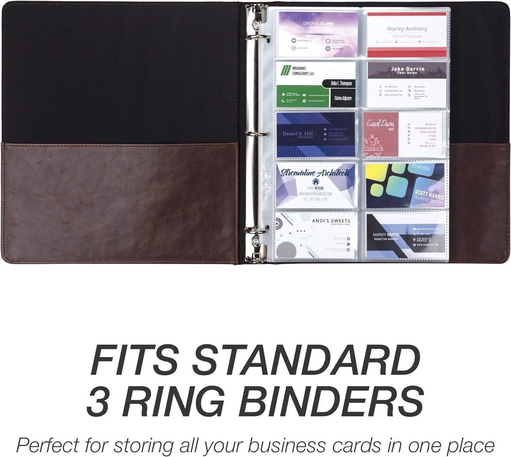 Business Card Holder Binder Pages Clear Sleeves Refill Organizer Book 25 pages CRYSTAL CLEAR VISIBILITY – Business card sheets have clear finish that provide optimum clarity for easy viewing SUPERIOR PROTECTION – 3.0 mil or .076mm thick polypropylene provides optimum performance and business card page is designed for durability and frequent daily use at home or office WON’T LIFT OR TRANSFER INK – PVC free, acid free, and archival safe business card holder sheets are made with non-stick material and will not lift copy from cards PROFESSIONAL LOOK AND FEEL – The clear view finish and heavy duty feel provide a premium product that is perfect for storing important contact information DURABLE SOLUTION – Clear insert sheets are made from polypropylene, a neutral material that’s stronger and more durable than vinyl Achieve superior protection for business cards with these heavyweight clear business card protector sheets. Available in a value pack of 25 clear insert sheets, these plastic sleeves help you protect individual business cards from dirt, debris, liquid and other contaminants while ensuring excellent readability to the materials inside. Each business card page is perfectly sized to hold 3.5” x 2” cards in any standard three-ring. Each double-sided page is designed to hold 20 cards (10 on each side) for added capacity. Samsill heavy duty clear business card pages are made of durable and high-quality PVC-free, non-stick polypropylene material that keeps your valued cards/contacts safe and organized in a busy work, home, or school environment. Not only they remain protected from spills, dirt and smudges, the clear polished finish also maintains a crisp and clear view of the content inside. The acid-free and archival safe polypropylene will not lift or transfer ink or photocopy in any way. Each heavy-duty card protector meets industry standards and measures 3 mil or .076mm thick to ensure superior performance and strength. The professional clear protective sheets feature side-loading orientation that allows quick adding or removing of cards. All the business card protector sheets feature three pre-punched holes at the edge to allow easy storage and organization. They can easily fit into any 3-ring binder. 0.25 inches x 8.25 inches x 11.25 inches. Weight: 0.01 oz Item model number 81090 Style Protection Color Clear Business Cards Material Polypropylene (PP) Material Type Polypropylene (PP) Manufacturer Part Number 81090 Item Weight 0.01 Ounces Is Discontinued By Manufacturer No Product Dimensions 8.25 x 0.25 x 11.25 inches Size 25 Pack