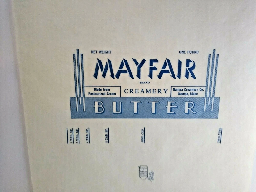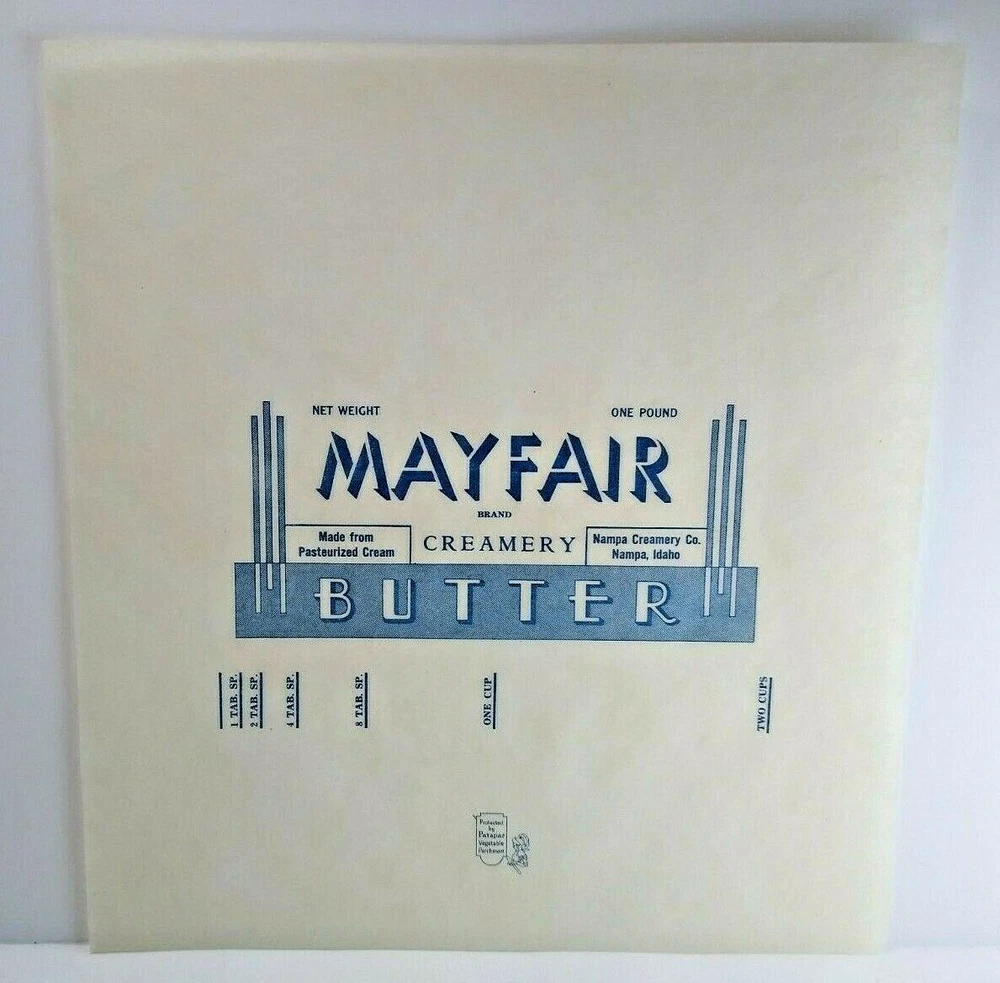 Butter Wrapper Mayfair Napa Idaho One Pound Vintage Original Circa 1940's NOS Original vintage circa 1940's era unused butter wrapper. Excellent condition 8.75" x 9.75". More vintage wrappers in our store. SHIPPING Buyer pays shipping and handling. Bundle and save by using cart and making single payment. International buyers are responsible for any import fees/taxes. ABOUT US Seller of vintage collectibles, gifts, advertising, artwork, original pinball flyers, vinyl records, video arcade flyers, pinball machine translites, game manuals, score cards, magazines, antique Halloween and holiday postcards, Christmas items, super hero memorabilia, horror themed art. Bundle and save by using the cart.