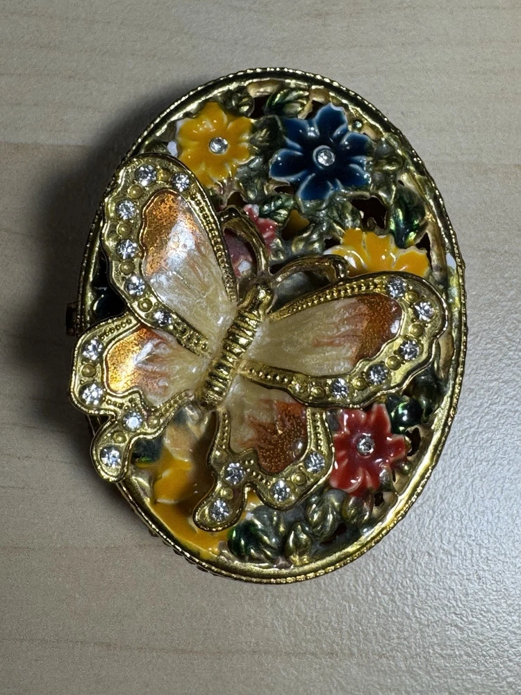 The product is a set of two mini trinket boxes in the shape of butterflies, adorned with rhinestones and floral enameled details in a gold color. These boxes are perfect for all occasions and are made of metal. The traditional style boxes feature a magnetic closure and are part of the Keepsake Boxes collection, adding a touch of elegance to any space. Each box measures 2.5 inches in length and is beautifully crafted in the United States, making them a unique and charming addition to any collection.