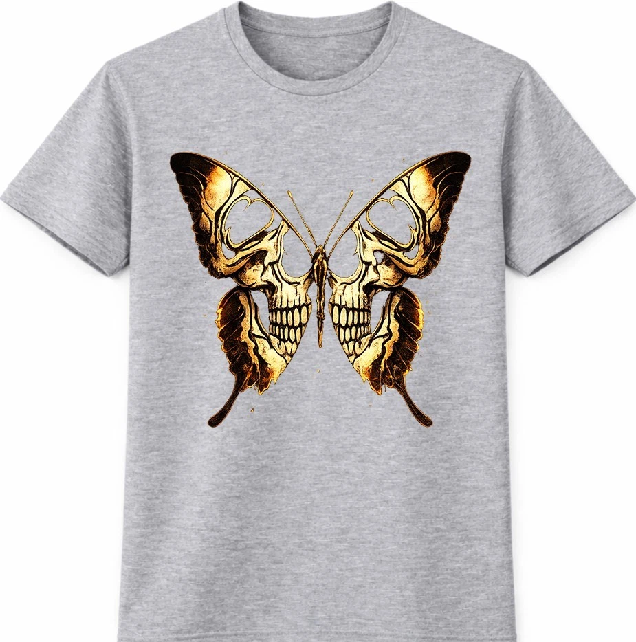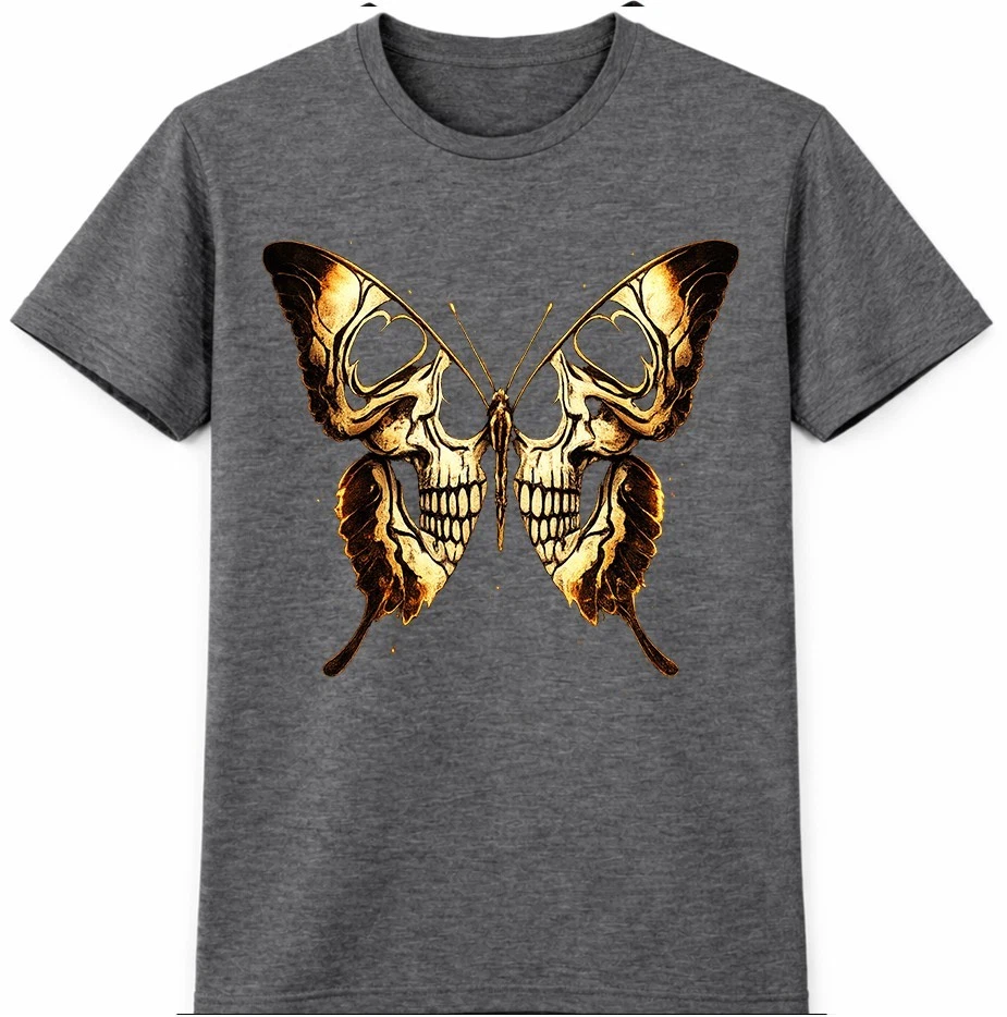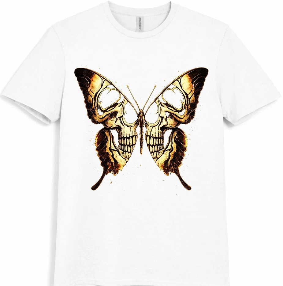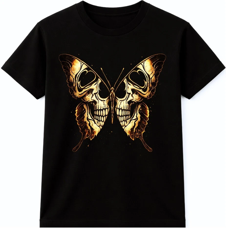 This graphic t-shirt features a striking skull butterfly design inspired by gothic and dark fantasy art. The detailed skull artwork forms butterfly wings, creating a bold tattoo-style look that stands out in alternative and streetwear fashion. Easy to wear and style, this graphic tee is ideal for casual outfits, concerts, and everyday looks. This graphic t-shirt showcases an eye-catching skull butterfly design that blends gothic and dark fantasy aesthetics. Intricate skull details are shaped into butterfly wings, giving the artwork a strong tattoo-inspired appearance. Designed for fans of gothic fashion, skull art, and alternative streetwear, this graphic tee works perfectly for casual wear, concerts, festivals, or layered outfits. The unique design adds a bold and expressive edge to any wardrobe while remaining versatile and easy to style.