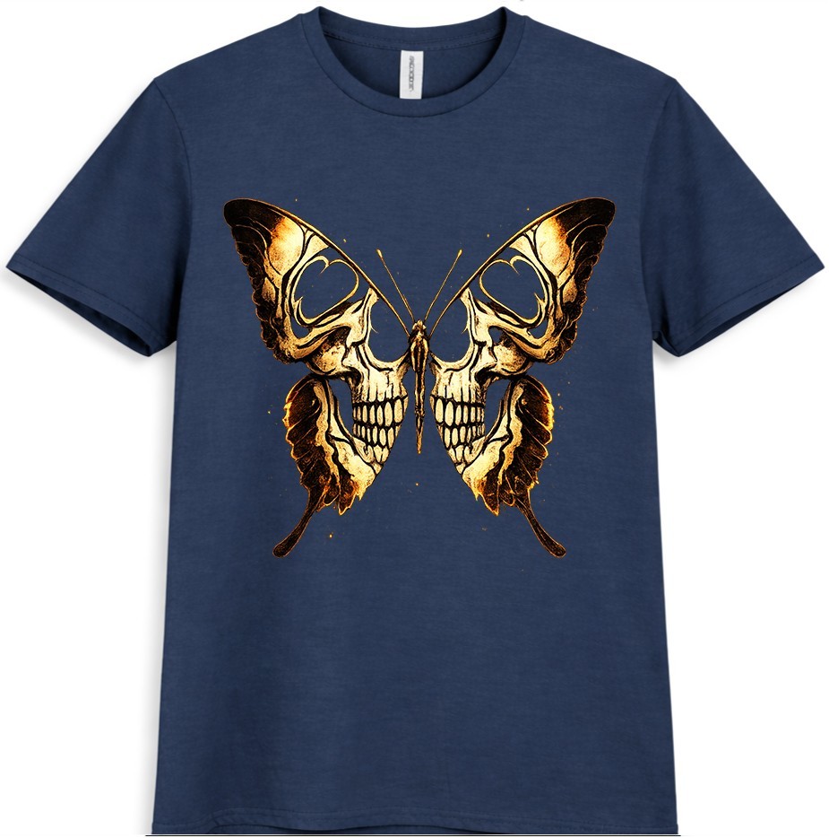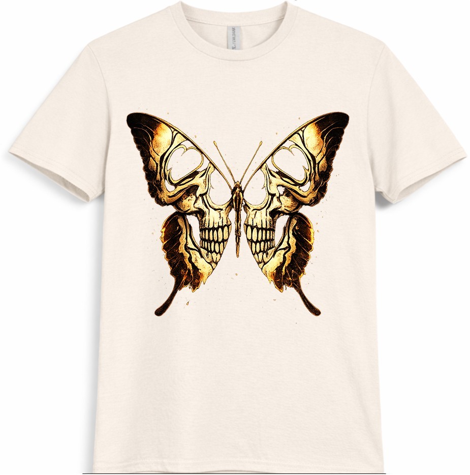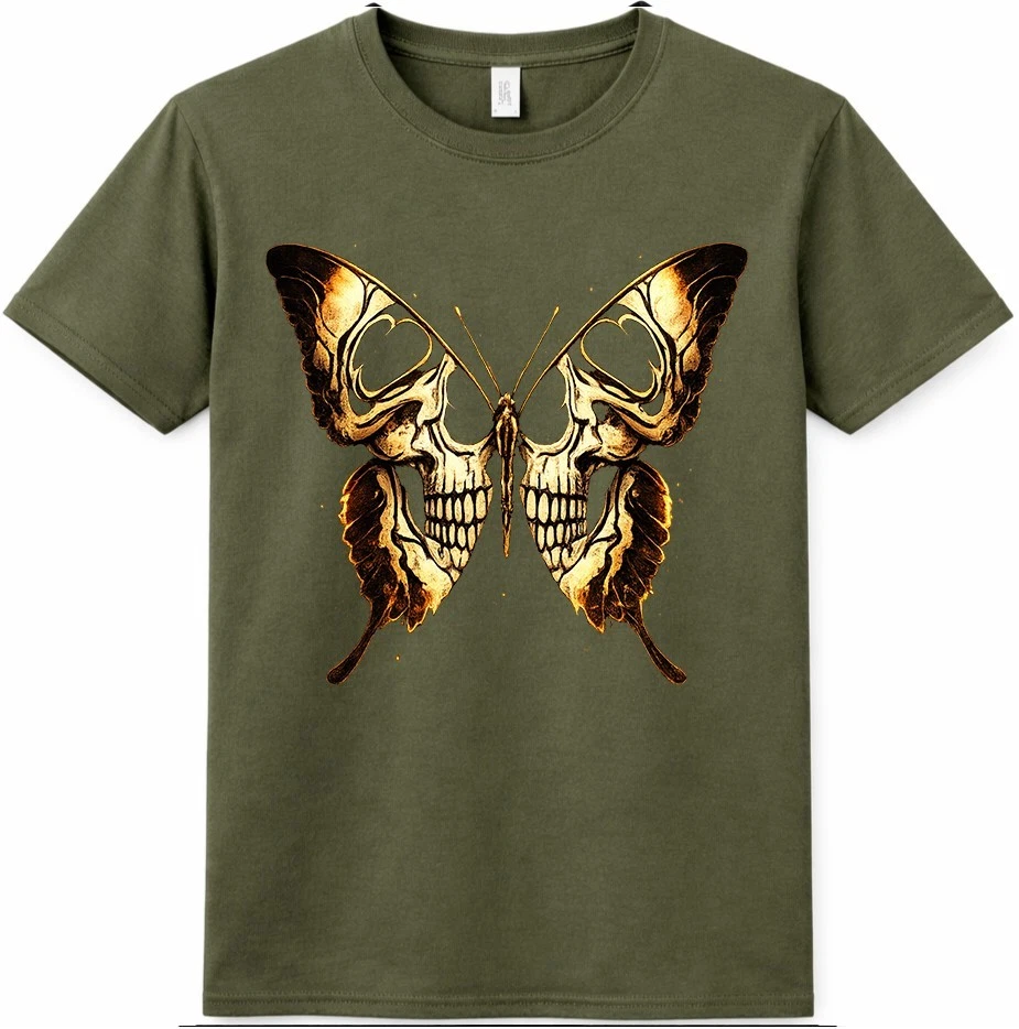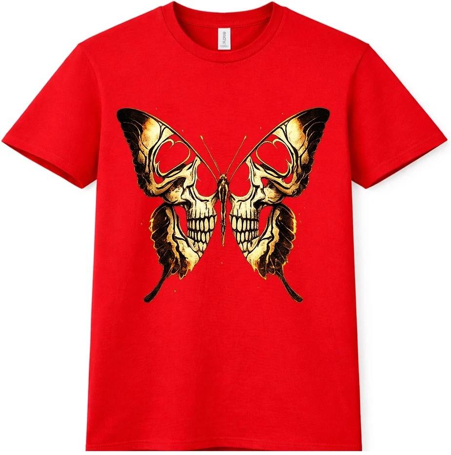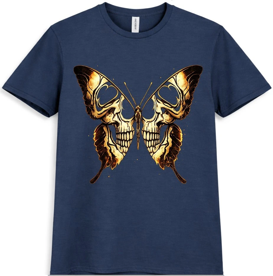 This graphic t-shirt features a striking skull butterfly design inspired by gothic and dark fantasy art. The detailed skull artwork forms butterfly wings, creating a bold tattoo-style look that stands out in alternative and streetwear fashion. Easy to wear and style, this graphic tee is ideal for casual outfits, concerts, and everyday looks. This graphic t-shirt showcases an eye-catching skull butterfly design that blends gothic and dark fantasy aesthetics. Intricate skull details are shaped into butterfly wings, giving the artwork a strong tattoo-inspired appearance. Designed for fans of gothic fashion, skull art, and alternative streetwear, this graphic tee works perfectly for casual wear, concerts, festivals, or layered outfits. The unique design adds a bold and expressive edge to any wardrobe while remaining versatile and easy to style.