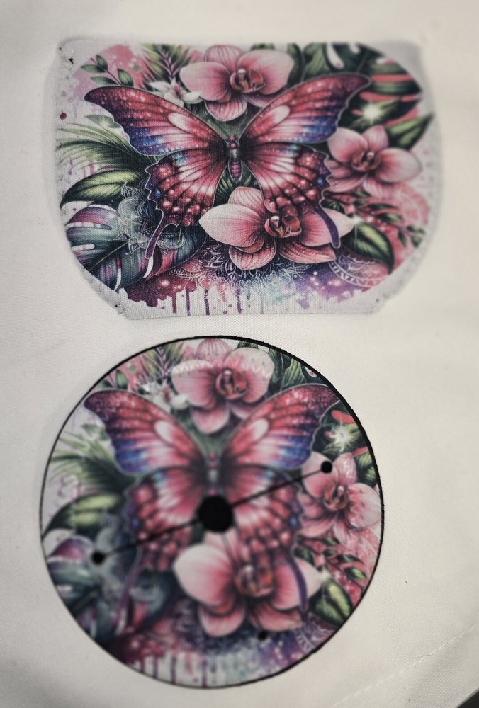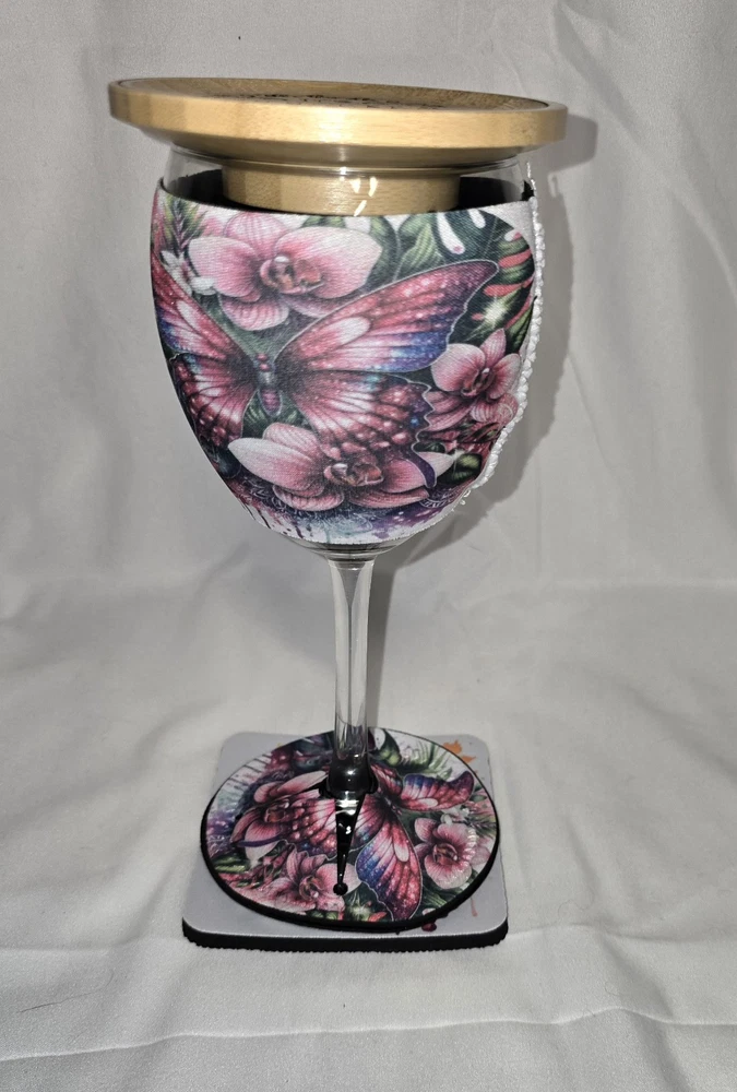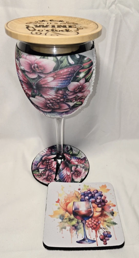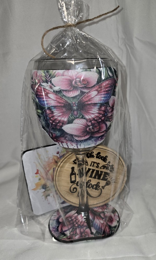 This Butterfly Wine Glass Gift Set is a beautiful and thoughtful gift option for Valentine's Day or Easter. The set includes a round wine glass with a butterfly design, along with a charcuterie board, wine koozie, and coaster. The multicolor design features butterflies and is engraved for a modern touch. Made from neoprene, wood, and glass, this handmade set is dishwasher safe and perfect for enjoying a glass of wine in style. It's a unique and elegant addition to any kitchen or dining collection.