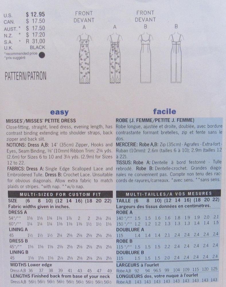 Butterick 6069 Misses S6-8-10 Evening Gown Sexy Slim Empire Slip Dress Pattern Butterick 6069 Misses S6-8-10 Evening Gown Sexy Slim Empire Slip Dress Pattern Butterick Sewing Pattern 6069, dated 1999 Women's Slim, Lined Evening Gown with Two Bodice Options Misses Sizes 6--8--10 are ALL included fits busts 30½--31½--32½" UNCUT, factory folded, new & unused condition Envelope has some faint sticker residue on front, otherwise very good ~I mail All patterns in an archival quality storage sleeve. ~I ship SAME or NEXT business day . . . always! ~I don't use tracking for patterns. They are shipping USPS Flat 1st Envelope. ~I personally guarantee delivery within 10 business days or you money back! Listing and template services provided by inkFrog