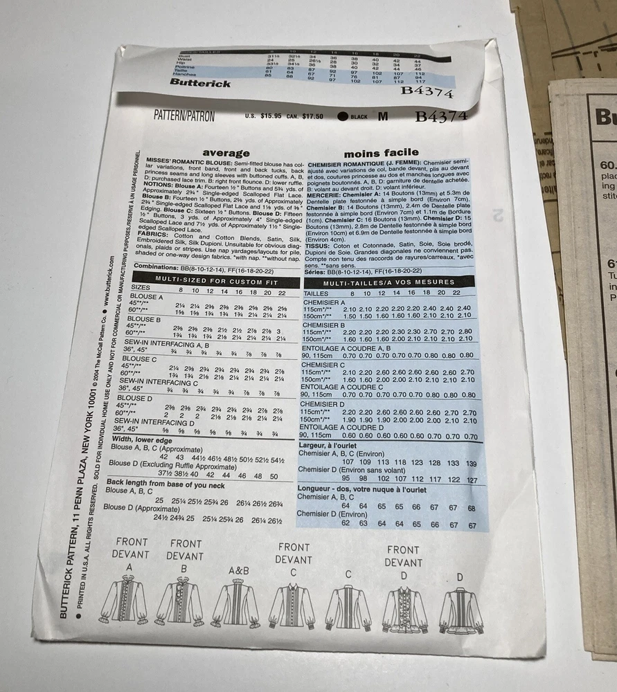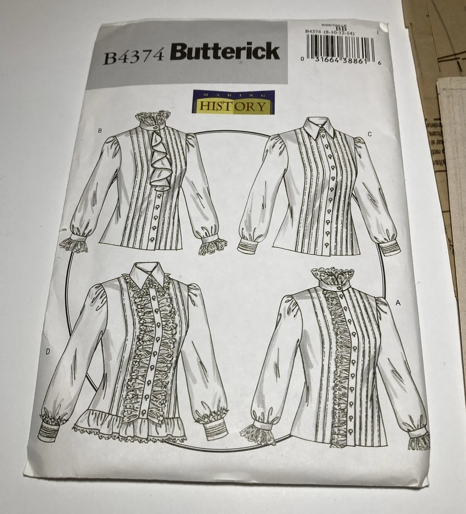 Butterick 8-10-12-14 Historic Sewing Pattern B4374 Romanitc Blouse Bust BB