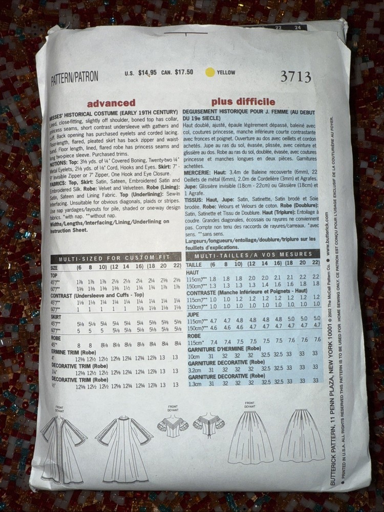 Butterick Pattern 3713 is a vintage pattern from the 2000s that includes designs for a queen Elizabeth skirt, top, and cape. The pattern is uncut and includes instructions for making costumes for adult and teen females in plus sizes 18, 20, and 22. Made in the United States, this pattern is perfect for those interested in sewing their own costumes for theater or cosplay.