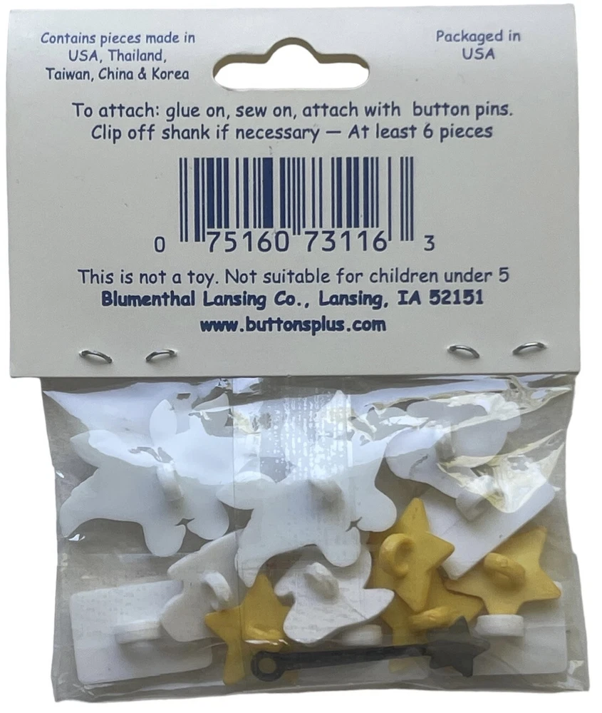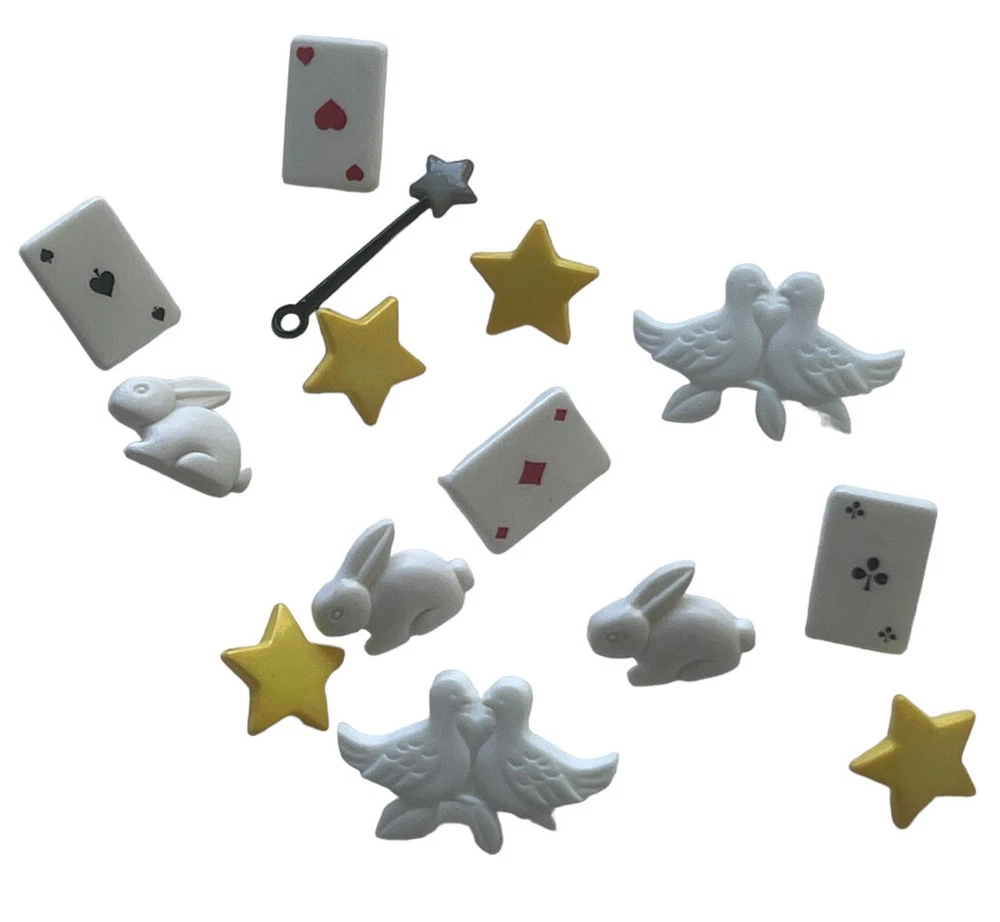 New Favorite Findings Blumenthal Lansing "Abracadabra" magician's magic props themed craft buttons including cards, doves, bunnies, magic wand, and stars. Packaged in the USA of pieces from the USA, Thailiand, Taiwan, China & Korea. Glue on, sew on, or attach.