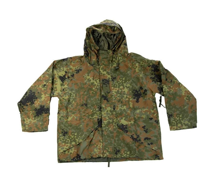 Bw Flecktarn ECWCS Cold Wet Weather Parka Bundeswehr Camouflage Jacket Small The description of this item has been automatically translated. If you have any questions, please feel free to contact us. BW Flecktarn ECWCS Gen I Parka Size Small Regular Fixed Cobra hood with peak Velcro and press studs for attaching additional camouflage material 2-way zipper under double Cover strip with hidden snap fasteners Armpit ventilation openings with zipper 2 large outside pockets with Velcro and press studs Patched sleeve pocket on the left side Sleeves adjustable with Velcro Snow apron inside Material made from breathable, waterproof 3-layer laminate Material: Upper material 100% nylon Membrane 100% polyurethane Lining 100% nylon Water column 5000mm Breathability: 3,000 gr/m² in 24 hours BW Flecktarn ECWCS Gen I Parka Size Small Regular Fixed Cobra hood with peak Velcro and press studs for attaching additional camouflage material 2-way zipper under double Cover strip with hidden snap fasteners Armpit ventilation openings with zipper 2 large outside pockets with Velcro and press studs Patched sleeve pocket on the left side Sleeves adjustable with Velcro Snow apron inside Material made from breathable, waterproof 3-layer laminate Material: Upper material 100% nylon Membrane 100% polyurethane Lining 100% nylon Water column 5000mm Breathability: 3,000 gr/m² in 24 hours Marke MMB ECWCS Flecktarn Thema Parka Cold Wet Weather