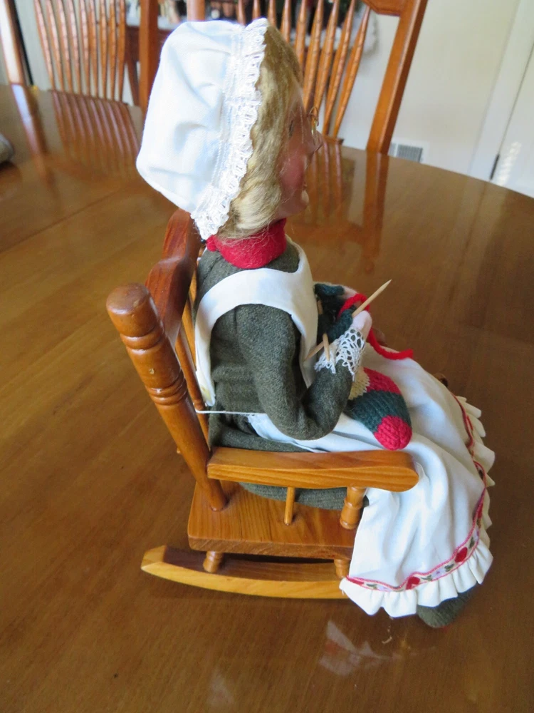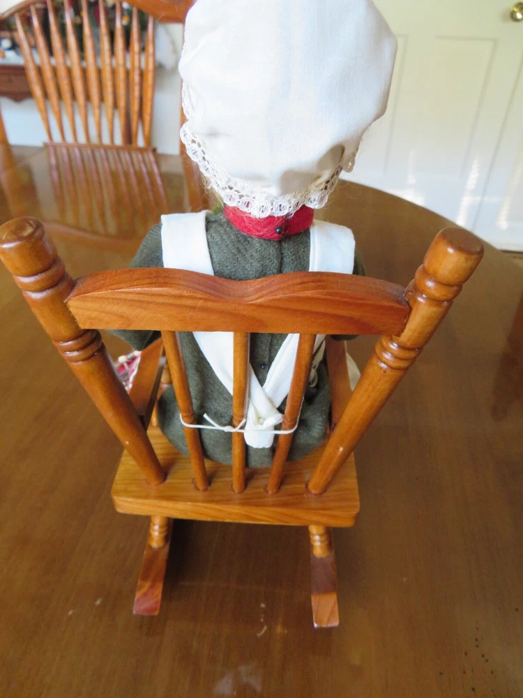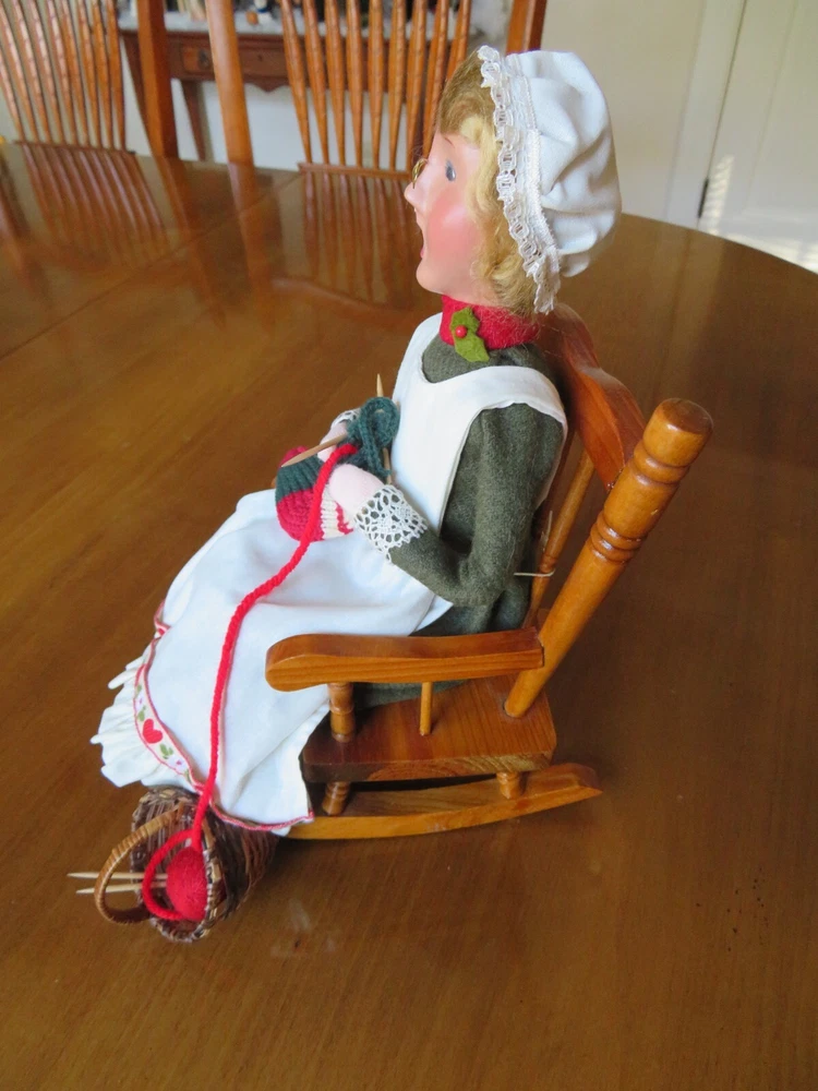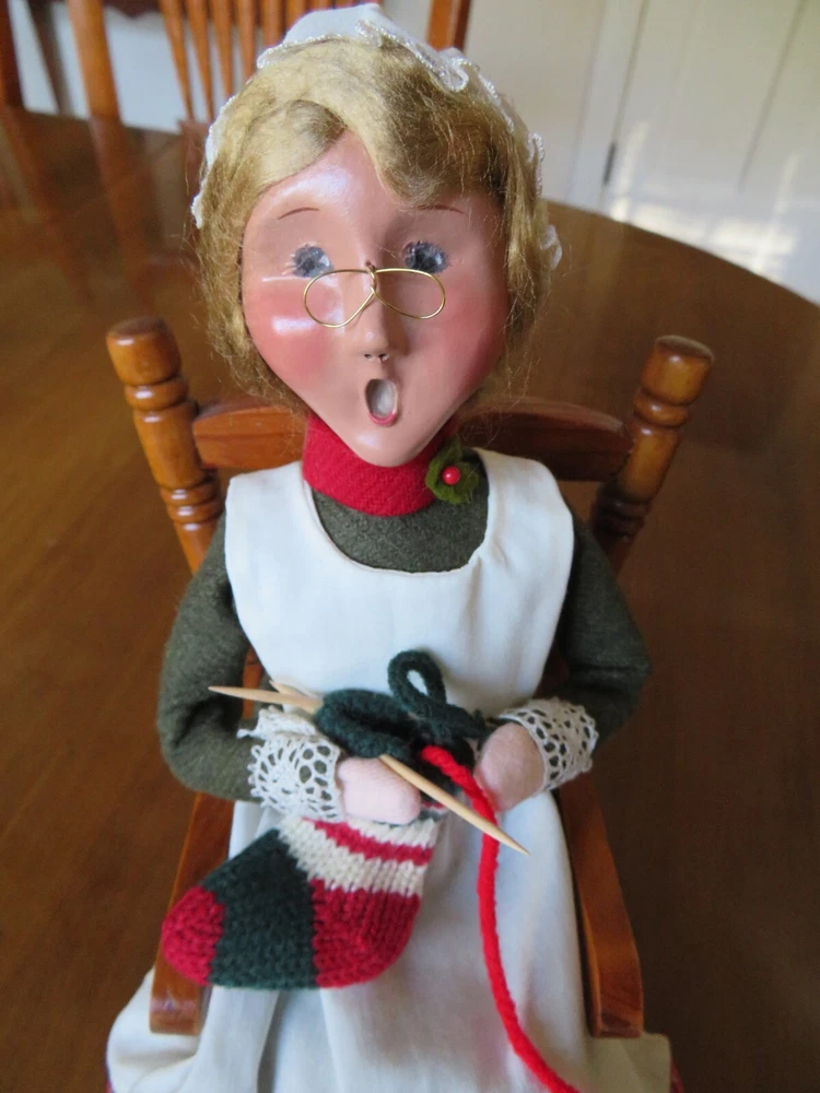 For your consideration is a 2005 Byers Choice Winterthur Exclusive Woman in a rocking chair knitting a Christmas Stocking. She, and her rocking chair are in excellent condition. The woman is wearing a green dress with a burgundy collar and lace cuffs. She has a full length apron embroidered on the bottom with hearts and flowers and a cute white cap trimmed in lace. The woman is knitting a Christmas stocking in red, green and white. At her side is a knitting basket with a ball of red wool and a spare set of knitting needles. Please view all photo's for more details. Please ask any questions in advance of purchase as I do not accept returns. I do want all my buyers to be pleased with their purchases so if you have an after sale issue, please contact me so we can work together to resolve it to your complete satisfaction. Shipping will be 1 - 3 days following confirmation of payment using USPS Ground Advantage. Apologies, but at this time I am only shipping within the Continental United States. Thanks for looking!