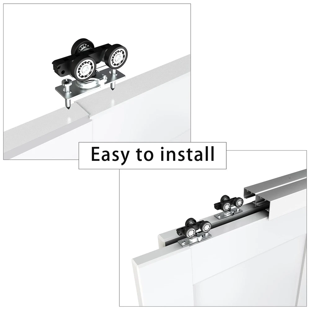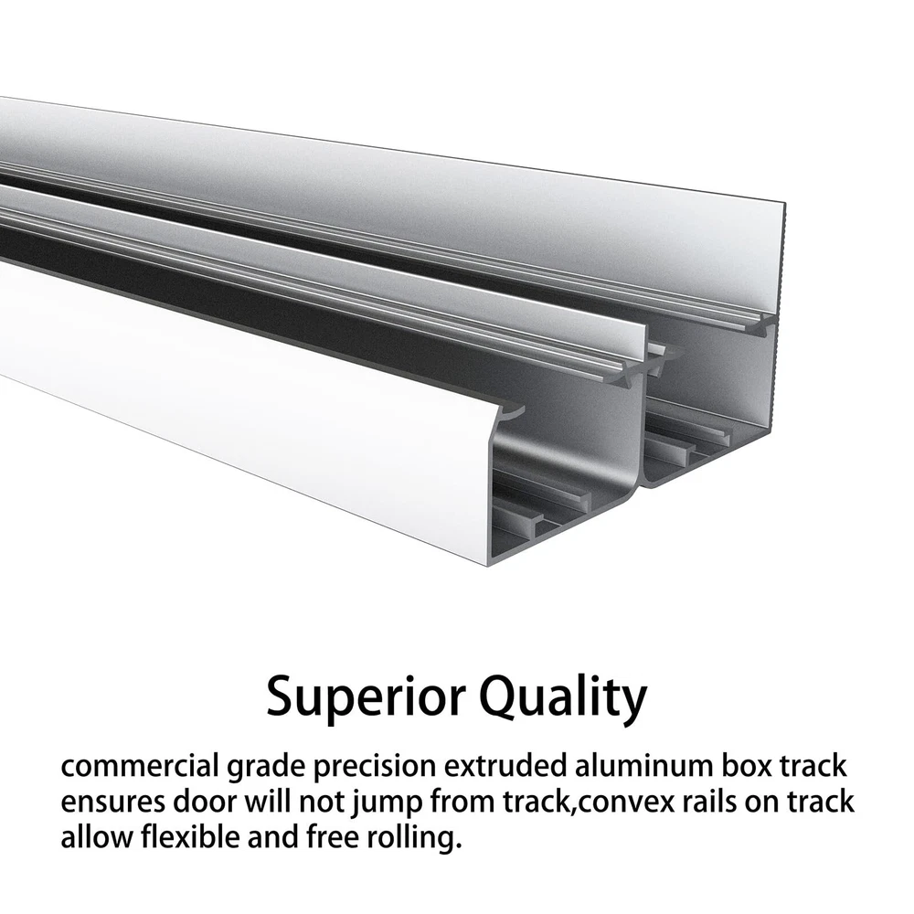 Specifications: Max Door Weight: up to 150lbs (68kg) per panel; Door panel thickness: 1 3/8" and 1 3/4"; Max Door panel width: 36 1/2"x2doors, track can be cut down to fit custom opening width(track length = 2 x door width -1"). Track dimension: 72"(L) x 4 3/4"(W) x 2 3/16"(H). High Quality: Commercial grade precision extruded aluminum box track ensures door will not jump from track, convex rails on track allow flexible and free rolling. Built-in front cover hides the sliding hardware from view. Smoothly and Quietly: Three wheel hangers guarantee all wheels carry door weight equally, with heavy-duty ball-bearing offer minimum friction and smooth, quiet rolling, tested beyond 100,000 rolls. Easy to Install: Quick release locking tab allows easy door installation/removal without dropping track. We also provide step-by-step graphic & text installation parsing manual. Widely Use: This track can be used for any space, living room, kitchen, bedroom, bathroom, laundry room, storage room, closet, study, checkroom, etc. Especially for low clearance. Quality Service: We are reliable and qualified manufacture of barn door and hardware. For any quality problems or missing parts, or installation problems, please let us know. Professional customer service team are whole day online to help you.