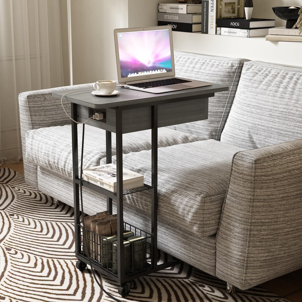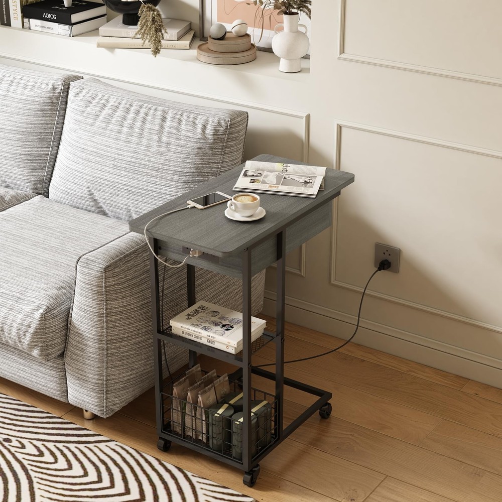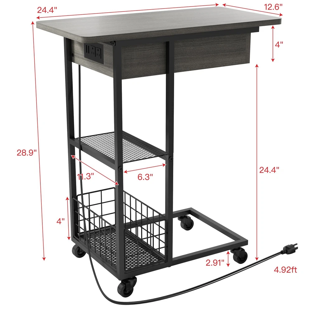 C Shaped End Table with Charging Station Patented Design: Uniquely Designed C Shaped Side Table with Charging Station, a Flip Top Drawer and 2 Tiers Storage Basket Shelf, small side table offers you ample space to storage, meets your charging needs when using electronic devices, within your arm's reach. Upgraded Version - The Charging Station is Designed on Your Left Vertical Side, which is safer to use. You don’t have to worry about electric shock caused by spilled coffee, water, etc. With 2 x USB Ports & 2 x 3-Prong Power Outlets - Low Battery Where is Power Outlet? No need to look around it’s within your arm’s reach. Also, the electrical cord is 6.5 ft long, enough to keep you away from wall corner where the home power outlet located. Thanks to the C-shaped Design, this C shaped sofa table can easily hug the side of your sofa or chair, you can also tuck it under your bed for more convenient use. NOTE: The height from the bottom of the wheel to the top of the base is 2.9”. The Attention to User Safety in Every Design Detail - First, the charging station is designed on the left vertical side instead of tabletop, keeping it away from spilled water. Secondly, the four corners of the tabletop are designed to be round so as not to hurt people. Multi-functional C-Shaped Table - Can be used as a side table, end table, bedside table, sofa table, nightstand, charging table, living room end tables, or bed tables adjustable over the bed. It is not only a C table, but also a side table with storage space, hidden drawer space with 2 shelves, the combination of privacy and open storage makes it more convenient for you to work from home, ideal for small spaces.