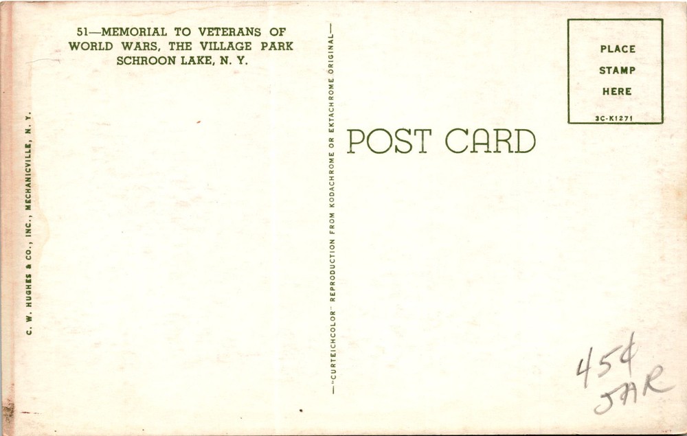 MAKE AN OFFER. THE MORE YOU BUY THE BETTER DEAL I WILL ACCEPT This postcard features a memorial to veterans of the World Wars located in the Village Park of Schroon Lake, New York. The image is a Curteichcolor reproduction from an original photo taken with either Kodachrome or Ektachrome film. The postcard is produced by C. W. Hughes & Co., Inc.