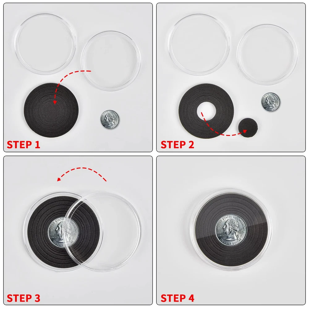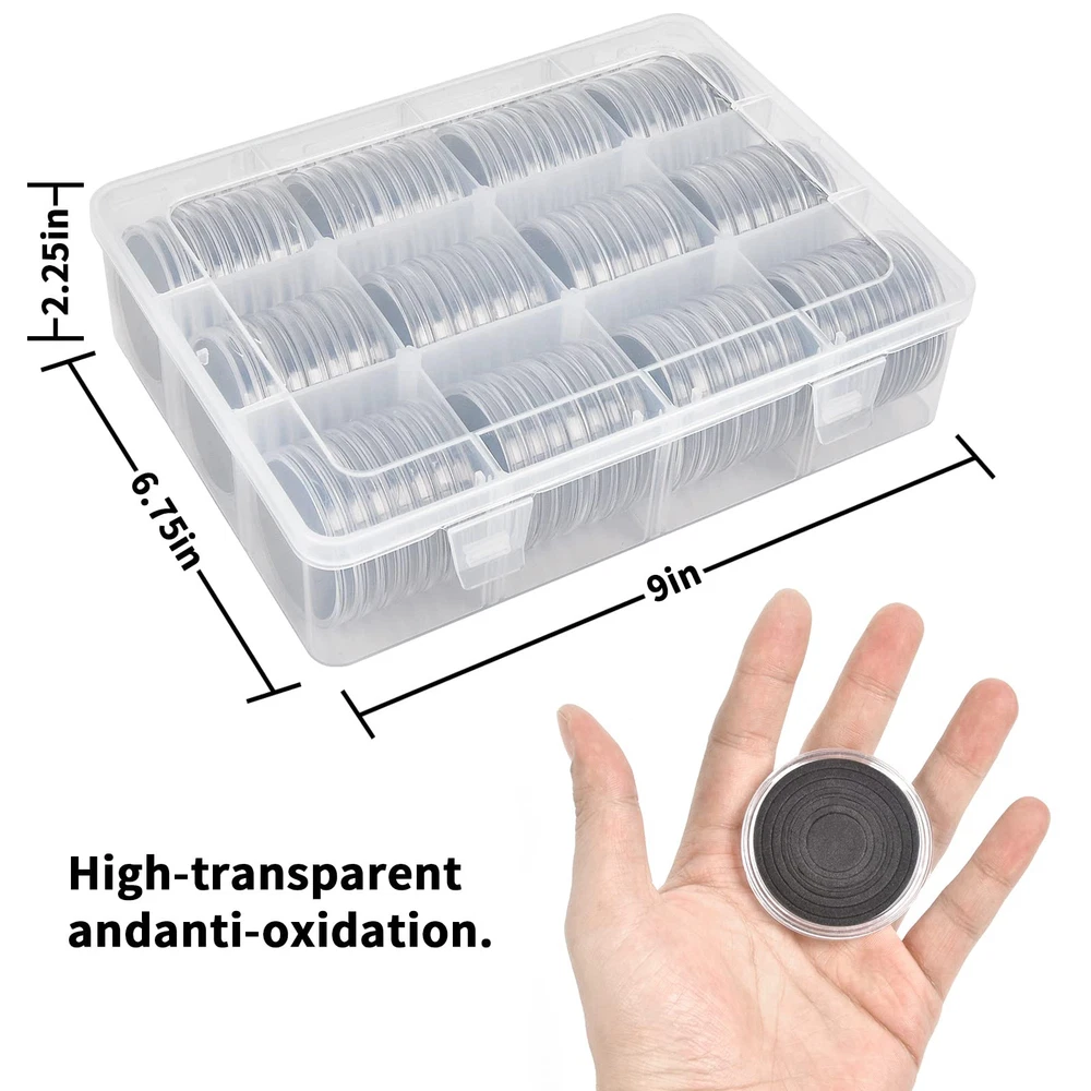 Package include: 84 pieces 46mm coin capsules, 84 pieces EVA foam gasket, one plastic challenge coin display case storage box. The protective Plastic storage with 12 grids, 9 removable dividers, every grid can contain 7 coin capsules. Size: 8.85 x 6.69 x 2.16 in. Universal silver dollar coin holders suitable for: The coin capsule inside size is 46*3mm, sutiable for holding almost all kinds of coins the diameter does not exceed 46mm, like 2020 - American Silver Eagle coins, bullion coins, challenge coins, or dollars, etc. 6 sizes foam gaskets (20/25/27/30/38/46mm), You can DIY the gaskets to fit your coin, prevent it from moving around. Double protection display Coin Trays & Coin Boxes: ntag215 Coin capsules are made of thickened plastic, transparent. The plastic coin holder organizer provide another protection to coin capsules, made of H&Q material, hold 84 capsules, keep them snug in place all the time, it can prevent capsules and coin from damage and falling off. Keep your coin clean and safe all the time. Convenient design coin collection supplies storage box: Crescent opening design make it convenient to open and close, the eva foam gasket easy to remove it to fit your coins. This coin holder protector come with 9 removable divider, you can easily to collect you coin in classification, each grid for different type coins. With 2 secure clip lock easy for closing and opening, keep your coin safety in place. Great as a present: Clear coin containers holder conduce to coin storage, view and exchange, great display coin holder, portable and easy carrying, good present for coin collectors to protect and store their favorite coins, with any quality problem, we will always on your service.