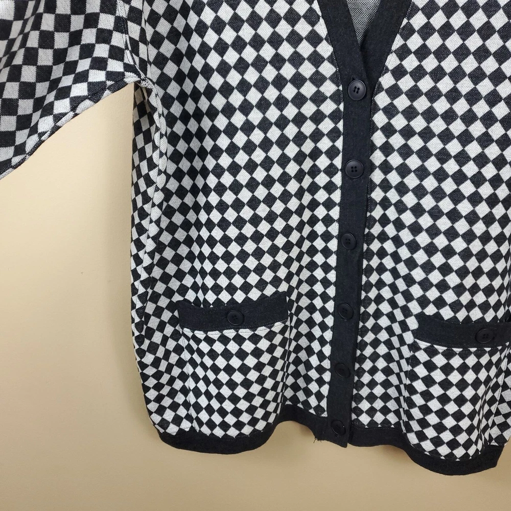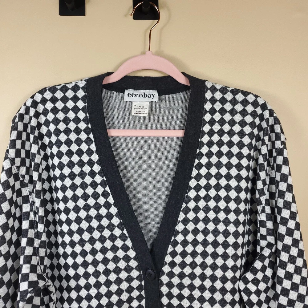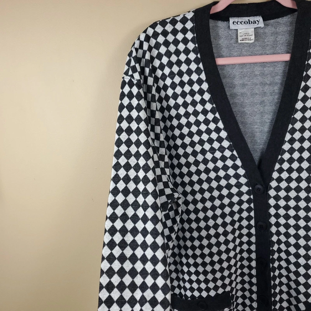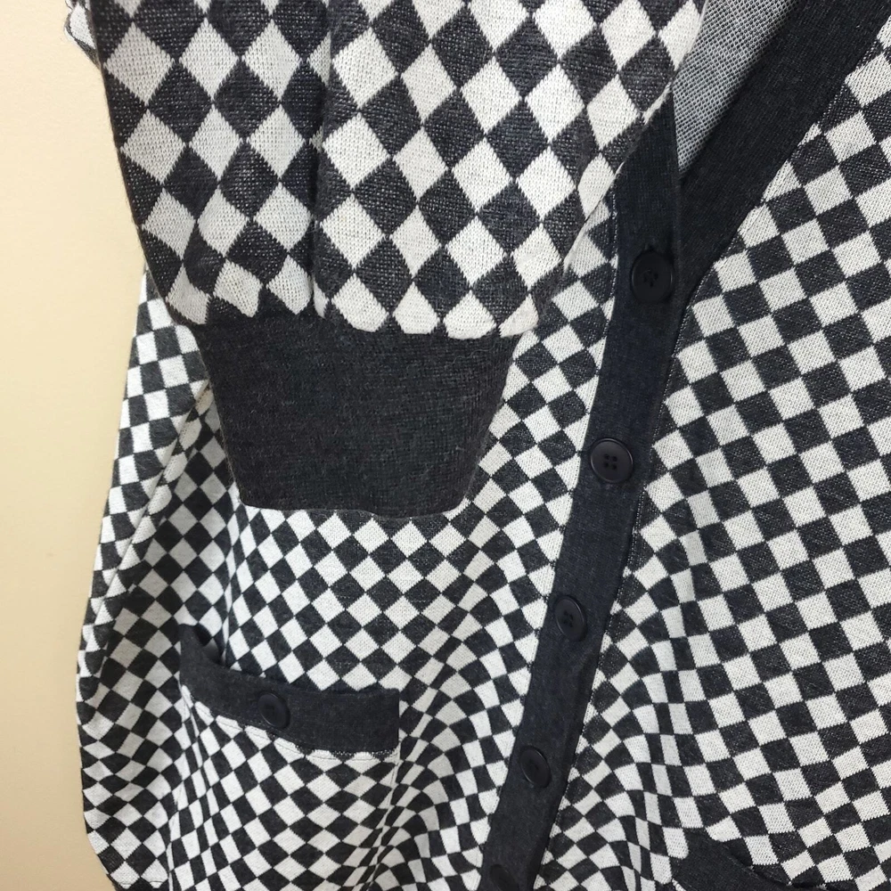 Gently used. Size large. Gray and white diamond print. Long sleeve grandpa sweater cardigan. Button front, pockets on the front, v-neck, longer length.