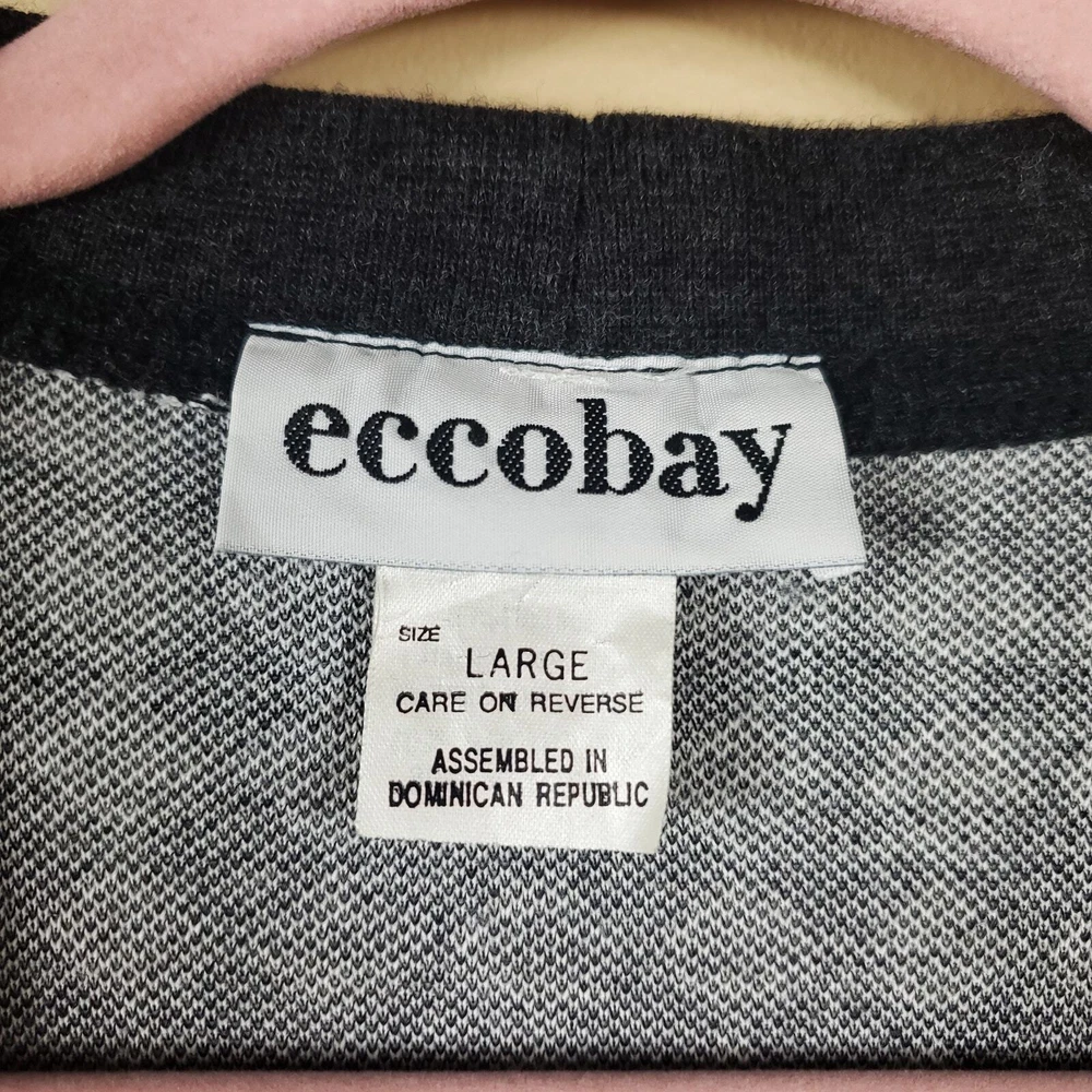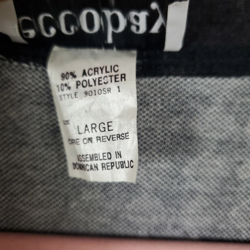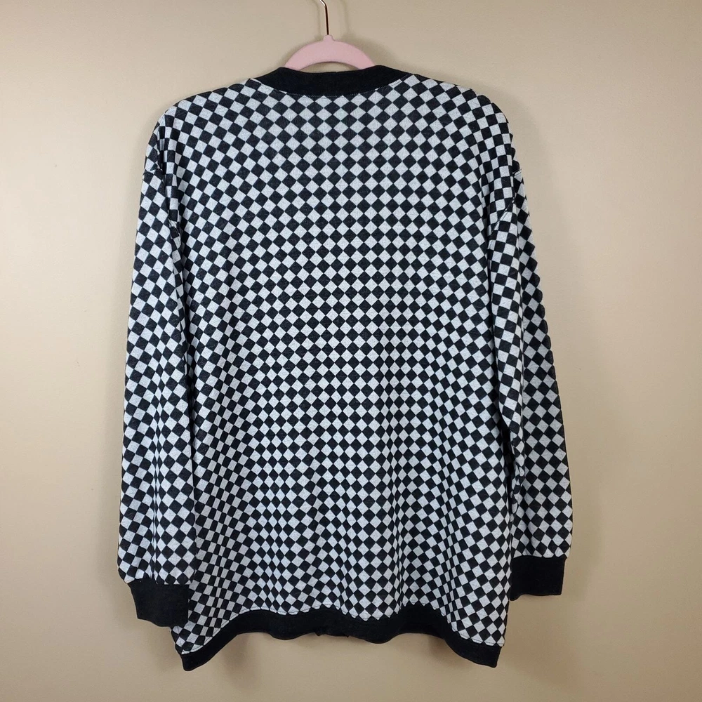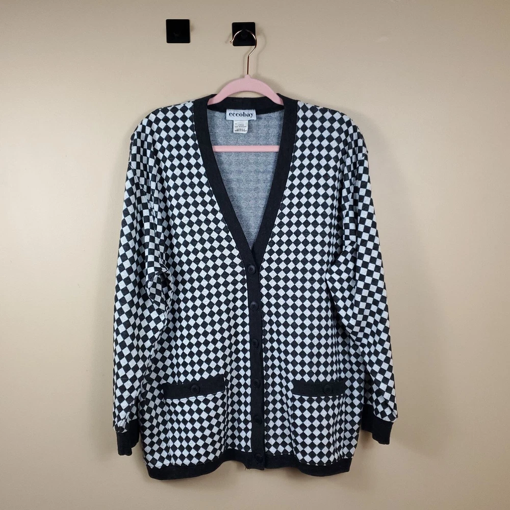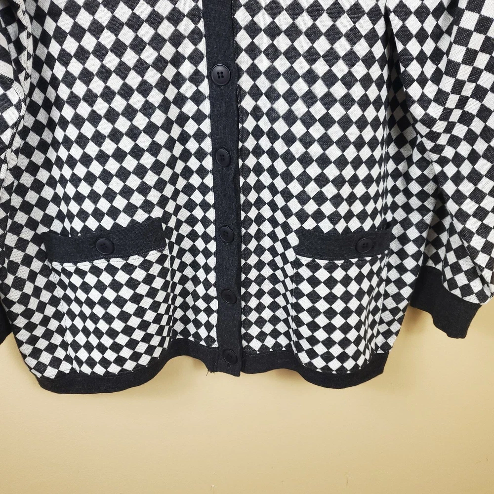 Gently used. Size large. Gray and white diamond print. Long sleeve grandpa sweater cardigan. Button front, pockets on the front, v-neck, longer length.