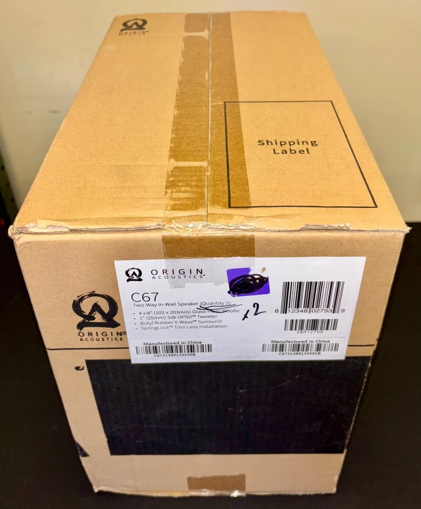 Features: tool less installation Connectivity: Wired UPC: 812348027157 gtin13: 812348027157 Type: In-Wall Speaker Brand: Origin Acoustics Model: C67 MPN: D62 System Configuration: 5.0 Channel Color: Black Surround Sound Formats: THX, Audyssey DSX, Auro 3D Audio, Dolby Atmos, Dolby Digital, Dolby Digital EX, Dolby Digital Plus, Dolby Pro Logic, Dolby Pro Logic II, Dolby Pro Logic IIx Impedance: 6 Ohms Shape: Rectangular