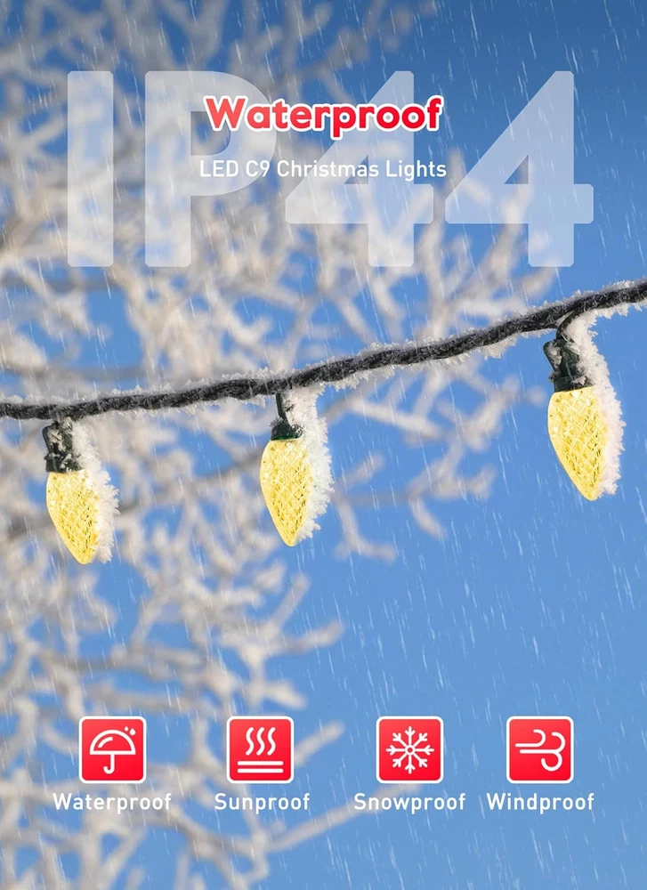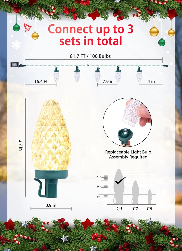 Color: Warm White Control Method: Remote Type: Does not apply Bulb Shape Size: C9 Occasion: Village Rustic Yard Porch Room House Garden Material: Plastic Style: Antique Bulb Base: E17 gtin13: 313037556595 Light Source Type: LED Special Features: LED C9 Strawberry-Shaped Bulbs, Christmas Tree Decorations, 8 Lig Special Feature: function(f) {var _np=(window.P._namespace("DetailPageProductOverv Usage: Indoor & Outdoor Christmas Decorations Use Indoor/Outdoor Usage: Outdoor UPC: 313037556595 Item model number: JT-EL/FC300V0200-C Item Weight: 3.23 pounds Number of Items: 100 Included Components: 102 LED C9 Christmas Lights (2 spare bulbs) Voltage: 120 Volts Batteries Required?: No Light Color: Warm White Water Resistance Level: Waterproof Power Source: Corded Electric Brand: Does not apply Color Temperature: 2.6E+3 Kelvin Size: 1 Pack Theme: Halloween Day, Thanksgiving Day, Christmas Day, New Year Seasons: Christmas Package Dimensions: 7.17 x 7.17 x 6.46 inches Controller Type: Remote Control Number of Light Sources: 100