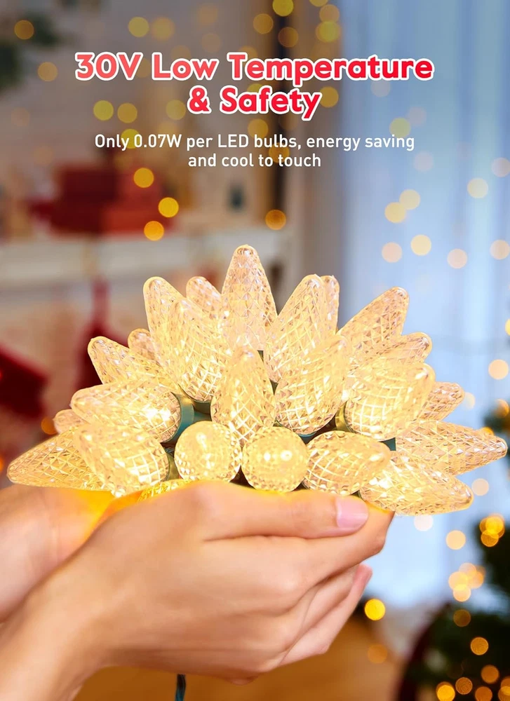 Store New Arrivals Add to Favorite View Feedback Contact Fast deliveries to the customer's home Quality customer service John Make the customers happy! C9 LED Christmas Lights Outdoor, 81 Feet 100 LED String Lights with Timer & 8 Lighting Mode, Waterproof Commercial Grade Extendable for Indoor outside Roofline Patio Home Xmas Decoration, Warm White Description Old Fashioned C9 LED String Lights: UL listed C9 holiday lights, 81.7 feet with 102 shatterproof diamond faceted strawberry bulbs(2 spare bulbs), plug in and start warm white lighting show, using magic wand to shake this C9 LED Christmas lights on or off to realize your childhood dream or to give a surprise to the family, children or kids 8 Modes Lighting and Timer Function: 8 vivid lighting effects available by mode button on adapter of this C9 Christmas lights outdoor, including combination, in waves, sequential, slow glow, chasing/flash, slow fade, twinkle/flash, steady on; There is also a timing (Hold the button for 3 seconds. The green light will turn on, starting the 6H on/18H off timer) and memory function Easy to Install and Connectable: Easy to hang up this C9 Christmas lights or place it anywhere necessary. Up to 3 sets connectable, thus 245 feet. 300LED available to go along the roof, covering larger area to enliven your home, patio or garden, creating an appealing and inviting atmosphere Shatterproof and Waterproof: This Christmas tree lights with impact resistant, shatterproof & break resistant C9 LED bulbs, can withstand careless dropping from hanging position. NOT cracking even stepping on it; The C9 LED outdoor Christmas lights is IP44 waterproof and can be used indoor and outdoor Safety and Energy Efficiency: With a 30V low output adapter, these christmas tree decoration lights prioritize safety and energy efficiency. Sturdy construction ensures durability, maintaining a cool temperature even during extended use. High durability LEDs save up to 80% energy compared to traditional incandescent bulbs Indoor Outdoor Decorations: It is fabulous C9 LED Christmas decorations for home, roof, garden, patio, balcony, porch, pergola, deck, eave, Christmas tree, roof line, gutter, shingle, hallway, pathway, walkway, fence, garland, wreath, shelf, bistro, pub, cafe, restaurant, shopping center, supermarket, mall, wedding, school party, New Year, birthday, gathering Product Description Light Source Type LED Item model number JT-EL/FC300V0200-C Style Antique Number of Items 100 Power Source Corded Electric Number of Light Sources 100 Control Method Remote Theme Halloween Day, Thanksgiving Day, Christmas Day, New Year Usage Indoor & Outdoor Christmas Decorations Use Controller Type Remote Control Batteries Required? No Bulb Shape Size C9 Material Plastic Seasons Christmas Package Dimensions 7.17 x 7.17 x 6.46 inches Included Components 102 LED C9 Christmas Lights (2 spare bulbs) Indoor/Outdoor Usage Outdoor Light Color Warm White Water Resistance Level Waterproof Item Weight 3.23 pounds Occasion Village Rustic Yard Porch Room House Garden Special Features LED C9 Strawberry-Shaped Bulbs, Christmas Tree Decorations, 8 Lighting Modes, Memory Function, UL certified, Waterproof, Connectable, Timer Function: 6H on & 18H Off Special Feature function(f) {var _np=(window.P._namespace("DetailPageProductOverviewTemplatesJava"));if(_np.guardFatal){_np.guardFatal(f)(_np);}else{f(_np);}}(function(P) { P.when('A').execute(function(A){ A.on('a:truncate:po-attribute-truncate-3:updated', function(data) { var isTruncated = !data.truncateInstance.getIfTextFits(); var seeMoreElement = document.getElementById('po-attribute-see-more-id-3'); if(seeMoreElement) { seeMoreElement.style.display = isTruncated ? '' : 'none'; } }) }); })); LED C9 Strawberry-Shaped Bulbs, Christmas Tree Decorations, 8 Lighting Modes, Memory Function, UL certified, Waterproof, Connectable, Timer Function: 6H on & 18H Off See more Bulb Base E17 Color Temperature 2.6E+3 Kelvin Color Warm White Voltage 120 Volts Size 1 Pack ABOUT US We offer the best prices around on high quality products. Our E-store includes media such as books, movies, music and games while offering electronics, toys, sporting apparel, clothing, tools, general home, garden items and more. SHIPPING We are always working hard to ensure your package arrives as soon as possible. Please understand that some factors like weather, high postal traffic, and the performance of shipping companies are outside of our control. We offer free shipping to the lower 48 states and ship within 2 business days of payment, usually sooner. We do not accept P.O. Boxes. Please provide a physical address. For shipping outside of the continental USA, we only use eBay's Global Shipping Program. The item is shipped to KY and then sent to the rest of the world. International customers are responsible for all duties and taxes. Continue to 'check out' to calculate costs for shipping the item to your country. Messages regarding eBay's Global Shipping Program MUST be directed at eBay EXCLUSIVELY. RETURNS We offer a 30-Day Return Policy on items in which you are not completely satisfied with. You have the option of a full-refund or an exchange of the item. No returns are available on items shipped outside of the USA PAYMENT We accept PayPal. CONTACT US This page content is yet to come Please ad us to your favorite seller and visit again later Thank You CUSTOMER SATISFACTION We try our very best to make sure every customer is completely satisfied. If there's a problem, message us! We're happy to help. WE ACCEPT