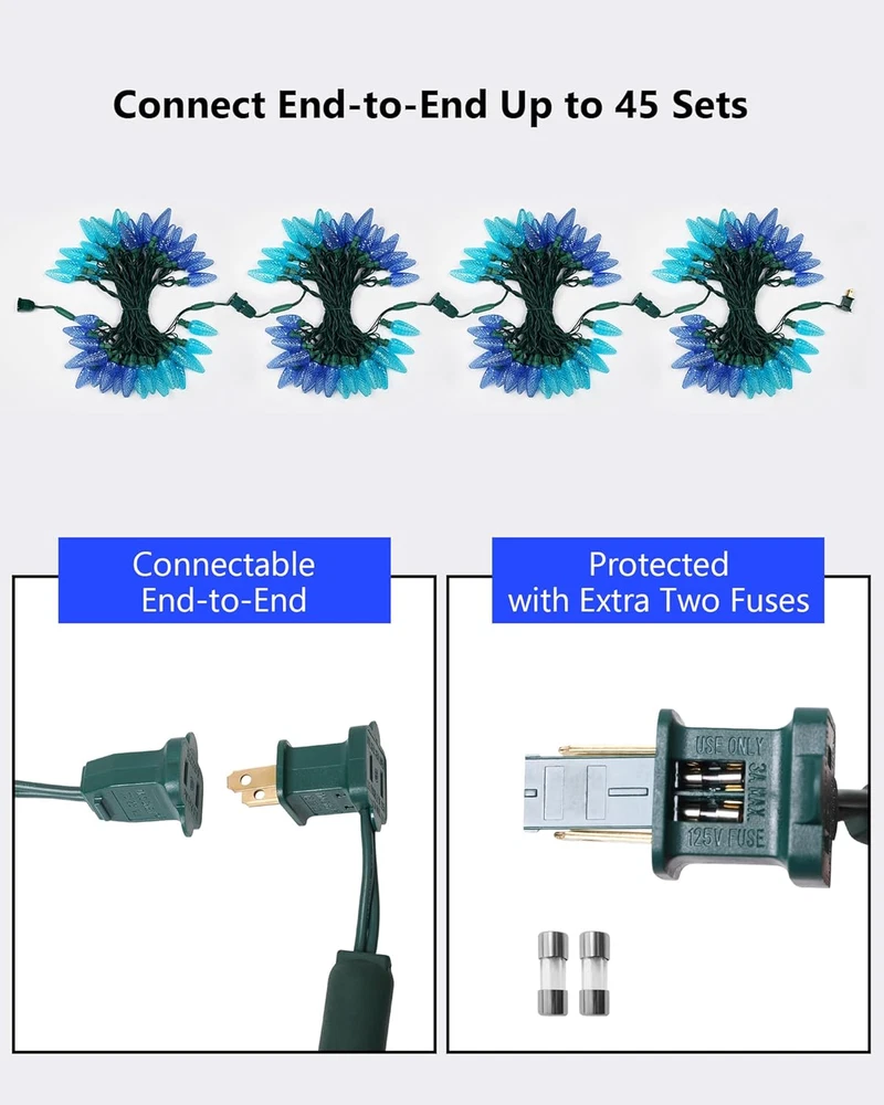 Store New Arrivals Add to Favorite View Feedback Contact C9 LED Christmas String Lights, 33.33Ft 50 LED Outdoor Indoor Decorative Light Strand, Xmas Holiday Lights for House, Christmas Tree, Patio, Party Decoration, Turquoise & Ice Blue, UL Listed Description Item model number I1-50-2-C9 Light Source Type LED Style C9-1 Pack, Turquoise & Ice Blue Power Source Corded Electric Number of Light Sources 50 Control Method Remote Light Direction Adjustable Theme Christmas Batteries Included? No Maximum Compatible Wattage 216 Watts Controller Type Remote Control Batteries Required? No Bulb Shape Size C9 Average Life 50000 Hours Seasons Christmas Package Dimensions 14.53 x 6.89 x 4.09 inches Included Components C9 LED Christmas String Lights, 2 Extra Replacement Fuses Indoor/Outdoor Usage Outdoor Light Color Turquoise & Ice Blue Water Resistance Level Waterproof Item Weight 2.35 pounds Specific Uses Outdoor, Indoor Occasion Christmas Decoration Special Features IP44 Waterproof, End to End Connectable, Super Brightness & Energy Saving Special Feature IP44 Waterproof, End to End Connectable, Super Brightness & Energy Saving Part Number I1-50-2-C9 Color Turquoise & Ice Blue Wattage 4.8 watts Shape Strawberry Voltage 120 Volts Size 1 Pack 【C9 Turquoise & Blue LED Lights】25 count C9 turquoise LED bulbs and 25 count blue bulbs. Illuminate your Christmas display with the vibrant and enchanting glow, creating a unique and eye-catching color combination. 33.3 feet total length, 8” evenly-spaced bulb apart on green wire, 4” lead in length; 【Super Brightness & Energy Saving】Brighter than traditional incandescent string lights, steady on lighting, beautifully bright, emits vivid & brilliant light through the bulb’s core. The LED bulb stays cool when touched, reduces power consumption, and saves money. 【Durable and Waterproof】With quality LEDs and weatherproof construction(IP44 waterproof), Don’t worry about using it in heavy rain and snow. (The plug is not waterproof and you need to do some protection or keep them away from water). The strong LED string lights provide years of high-quality long-lasting lighting, not easy to break apart. 【End to End Connectable】Simply, plug in and go! you can connect up to 45 sets together, and connect easily to your previous lights, end-to-end up to a maximum 216Watts(1.8Amps) total. It can meet your desired length and make your decoration more convenient. Each set comes with 2 extra fuses. 【Wide Application】UL listed. These lights are suitable for indoor and outdoor displays, a timeless classic on your house, and ideal decoration lights for room, roofline, garden, balcony, Christmas tree, party, and holiday decorations. Light up your holiday to enjoy Christmas! 【Customer Satisfaction】We offer 12 MONTH for all products and kind service, providing a 100% satisfaction experience is our main priority to our customers. Feel free to message us through “contact sellers” if products don't meet your expectations. Product Description Make Your Life Bright and Colorful with C9 Led Christmas String Lights 50-Count LED Christmas String lights with green wire use high-brightness LED bulbs, which can add light to your dark environment. The light creates a cheerful atmosphere when it's turned on and instantly brightens your mood. FEATURES: Vivid & Brilliant: C9 faceted bulbs look amazing and stand out in your home, bright enough to light up the outside of your house, creating color combinations and unique color patterns to give your light display a unique look. IP44 Waterproof: Durable for indoor and outdoor use, like home, patio, garden, and balcony, typically you can use these on your house roofline, on your Christmas tree, or wherever decoration lighting is needed, and any decorative project. 50000 Hours Longevity: The LED string lights provide years of high-quality long-lasting lighting, better construction and quality, not easy to break apart, NON-REMOVABLE bulb construction seals out moisture, eliminating corrosion for longer bulb life. Energy Efficient: These light sets use so little power (only 4.8 watts per set), energy-saving LED bulbs, budget-friendly, so you won’t spend as much money on your electrical bill. Allow you to decorate your lighting area with the desired length, making your decoration more convenient. Connected easily to your previous lights! Diamond Faceted 25-count C9 turquoise LED bulbs and 25-count blue bulbs. Beautifully bright, emits vivid & brilliant light through the bulb’s core. Package includes: 1 x 50 led string lights 2 x fuses per set 1 x user’s manual C9 LED String Lights, Multi-colored A set includes 50 LEDs These light sets feature non-removable bulbs, which means you don't have to screw in any light bulbs. Simply, plug them in and they are ready to go! Bulbs CANNOT BE REMOVED or REPLACED. Comes ready to install right out of the box. Also, they will still be cool-touch after lighting for a long time. Specification: Total Length: 33.3ft/set Lead Wire Length: 4inch Bulbs Spacing Length: 8inch Mode: Steady On Expandable: 45 Sets Application: Indoor/Outdoor Light up the upcoming Christmas! IP44 Waterproof Perfect for indoor & outdoor decoration. Lights can be utilized both indoor and outdoor without worry of rainy weather. High Brightness Brilliant, natural-looking glow that fills the bulb with vibrant color. Wide Range of Applications Widely apply for Christmas trees, Christmas, Party, Wedding, Home, Window, Bathroom, Festival, Holiday, Shows, etc. ABOUT US We offer the best prices around on high quality products. Our E-store includes media such as books, movies, music and games while offering electronics, toys, sporting apparel, clothing, tools, general home, garden items and more. SHIPPING We are always working hard to ensure your package arrives as soon as possible. Please understand that some factors like weather, high postal traffic, and the performance of shipping companies are outside of our control. We of