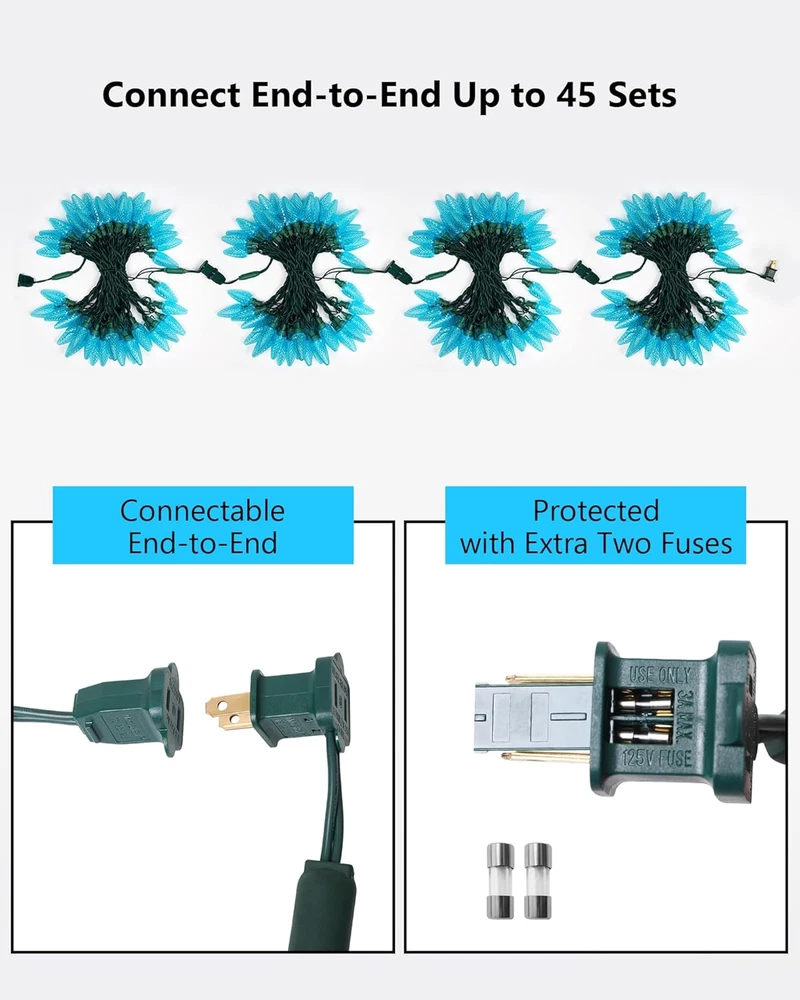 Store New Arrivals Add to Favorite View Feedback Contact C9 Led Christmas String Lights Outdoor, 33.3Ft 50 LED Waterproof Decorative Light Strand, Extendable Green Wire String Lights for House, Christmas Tree, Patio, Party Decoration, Turquoise Description Item model number I1-50-2-C9 Light Source Type LED Style C9-1 Pack, Turquoise Power Source Corded Electric Number of Light Sources 50 Control Method Remote Theme Christmas Style Number I1-50-2-C9 Controller Type Remote Control Occasion Type Christmas Decoration Seasons Christmas Additional Features IP44 Waterproof, End to End Connectable, Super Brightness & Energy Saving Package Dimensions 14.57 x 6.14 x 3.98 inches; 2.07 Pounds Indoor/Outdoor Usage Outdoor Light Color Turquoise Water Resistance Level Waterproof Occasion Christmas Decoration Special Feature IP44 Waterproof, End to End Connectable, Super Brightness & Energy Saving Bulb Shape Size C9 Color Turquoise Wattage 4.8 watts Indoor Outdoor Usage Outdoor Voltage 120 Volts Included Components 2 Extra Replacement Fuses, C9 Led Christmas String Lights Style Name C9-1 Pack, Turquoise Size 1 Pack 【C9 Turquoise LED Lights】50 count C9 turquoise LED bulbs. Illuminate your Christmas display with the vibrant and enchanting glow, creating a unique and eye-catching color combination. 33.3 feet total length, 8” evenly-spaced bulb apart on green wire, 4” lead in length; 【Super Brightness & Energy Saving】Brighter than traditional incandescent string lights, steady on lighting, beautifully bright, emits vivid & brilliant light through the bulb’s core. The LED bulb stays cool when touched, reduces power consumption, and saves money. 【Durable and Waterproof】With quality LEDs and weatherproof construction(IP44 waterproof), Don’t worry about using it in heavy rain and snow. (The plug is not waterproof and you need to do some protection or keep them away from water). The strong LED string lights provide years of high-quality long-lasting lighting, not easy to break apart. 【End to End Connectable】Simply, plug in and go! you can connect up to 45 sets together, and connect easily to your previous lights, end-to-end up to a maximum 216Watts(1.8Amps) total. It can meet your desired length and make your decoration more convenient. Each set comes with 2 extra fuses. 【Wide Application】UL listed. These lights are suitable for indoor and outdoor displays, a timeless classic on your house, and ideal decoration lights for room, roofline, garden, balcony, Christmas tree, party, and holiday decorations. Light up your holiday to enjoy Christmas! 【Customer Satisfaction】We offer 12 MONTH for all products and kind service, providing a 100% satisfaction experience is our main priority to our customers. Feel free to message us through “contact sellers” if products don't meet your expectations. Product Description Make Your Life Bright and Colorful with C9 Led Christmas String Lights 50-Count LED Christmas String lights with green wire use high-brightness LED bulbs, which can add light to your dark environment. The light creates a cheerful atmosphere when it's turned on and instantly brightens your mood. FEATURES: Vivid & Brilliant: C9 faceted bulbs look amazing and stand out in your home, bright enough to light up the outside of your house, creating color combinations and unique color patterns to give your light display a unique look. IP44 Waterproof: Durable for indoor and outdoor use, like home, patio, garden, and balcony, typically you can use these on your house roofline, on your Christmas tree, or wherever decoration lighting is needed, and any decorative project. 50000 Hours Longevity: The LED string lights provide years of high-quality long-lasting lighting, better construction and quality, not easy to break apart, NON-REMOVABLE bulb construction seals out moisture, eliminating corrosion for longer bulb life. Energy Efficient: These light sets use so little power (only 4.8 watts per set), energy-saving LED bulbs, budget-friendly, so you won’t spend as much money on your electrical bill. Allow you to decorate your lighting area with the desired length, making your decoration more convenient. Connected easily to your previous lights! Diamond Faceted 50-count C9 turquoise LED bulbs Beautifully bright, emits vivid & brilliant light through the bulb’s core Package includes: 1 x 50 led string lights 2 x fuses per set 1 x user’s manual C9 LED String Lights, Multi-colored A set includes 50 LEDs These light sets feature non-removable bulbs, which means you don't have to screw in any light bulbs. Simply, plug them in and they are ready to go! Bulbs CANNOT BE REMOVED or REPLACED. Comes ready to install right out of the box. Also, they will still be cool-touch after lighting for a long time. Specification: Total Length: 33.3ft/set Lead Wire Length: 4inch Bulbs Spacing Length: 8inch Mode: Steady On Expandable: 45 Sets Application: Indoor/Outdoor Light up the upcoming Christmas! IP44 Waterproof Perfect for indoor & outdoor decoration. Lights can be utilized both indoor and outdoor without worry of rainy weather. High Brightness Brilliant, natural-looking glow that fills the bulb with vibrant color. Wide Range of Applications Widely apply for Christmas trees, Christmas, Party, Wedding, Home, Window, Bathroom, Festival, Holiday, Shows, etc. ABOUT US We offer the best prices around on high quality products. Our E-store includes media such as books, movies, music and games while offering electronics, toys, sporting apparel, clothing, tools, general home, garden items and more. SHIPPING We are always working hard to ensure your package arrives as soon as possible. Please understand that some factors like weather, high postal traffic, and the performance of shipping companies are outside of our control. We offer free shipping to the lower 48 states and ship within 2 business days of payment, usually sooner. We do not accept P.O. Boxes. Please provide a physical address. For shipping outside 
