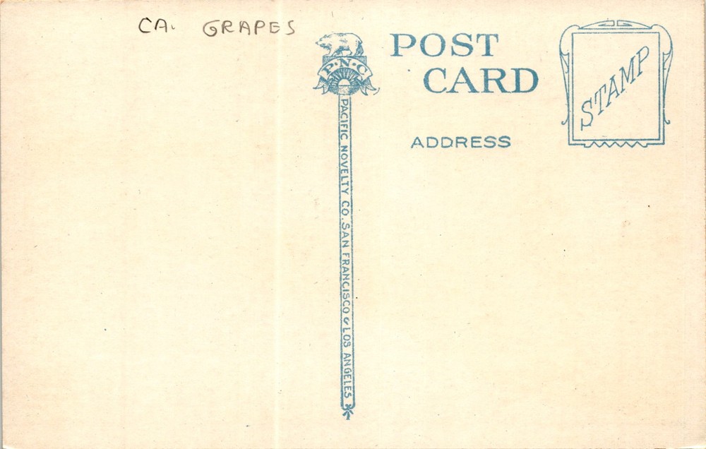 This postcard likely features an image or illustration related to California grapes, possibly produced by the Pacific Novelty Co. with locations in San Francisco and Los Angeles. The front of the postcard may showcase a design related to grapes or vineyards, while the back includes space for an address, stamp, and potentially a message.