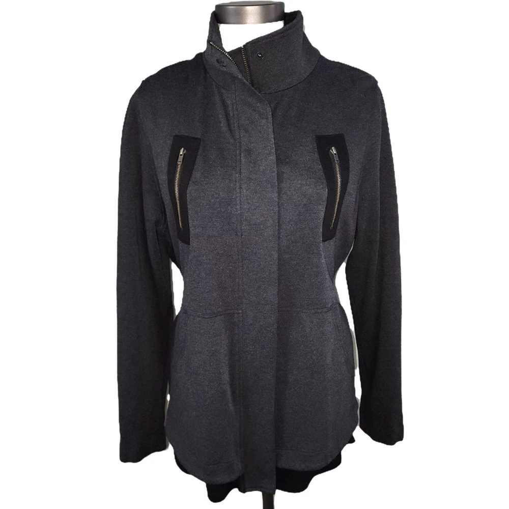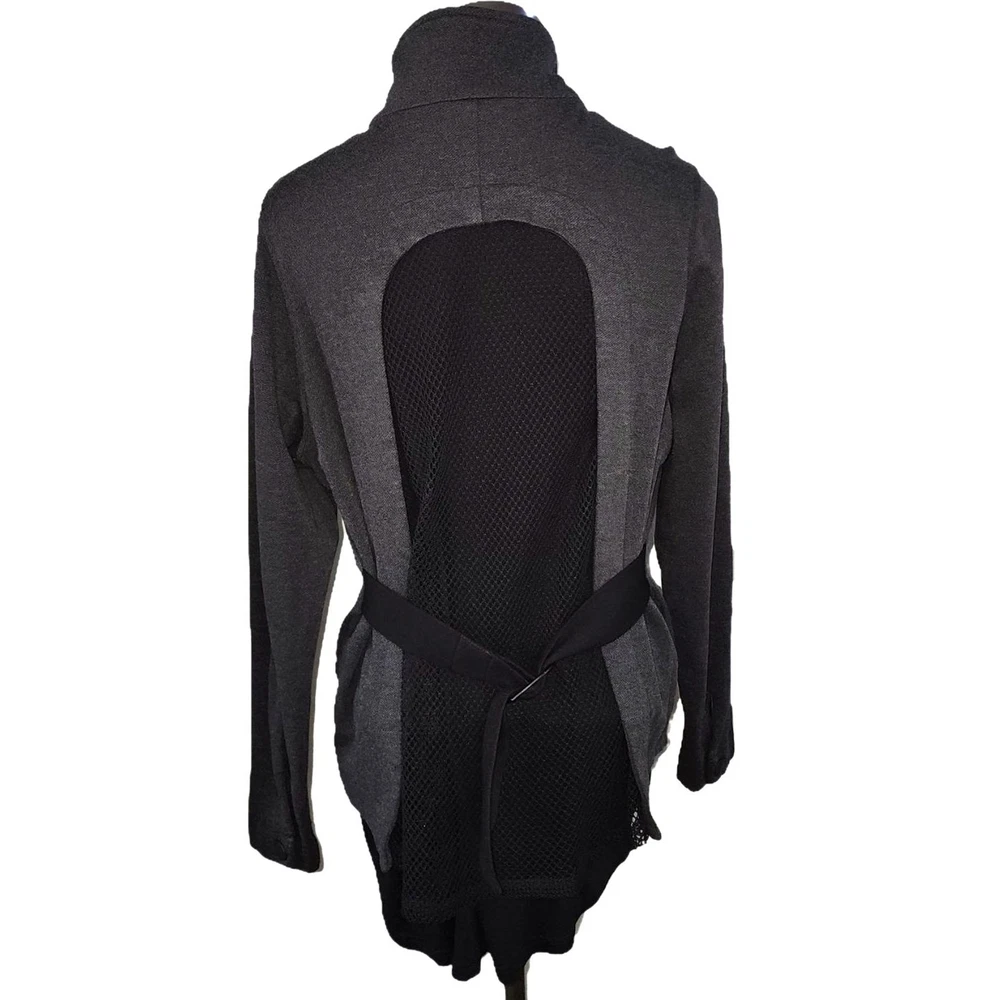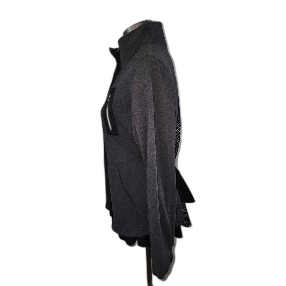 CABI 'Love Carol' Charcoal Grey Fleece Black Mesh Back Utility jacket Size M. This cute and chic jacket is made of super soft rayon, nylon and spandex blend with zipper closure and cute mesh back with adjustable cinch waist in front or back. Excellent condition.