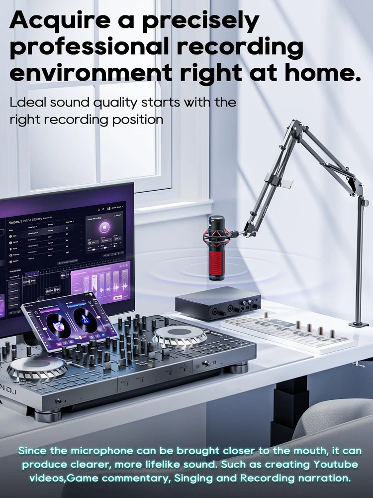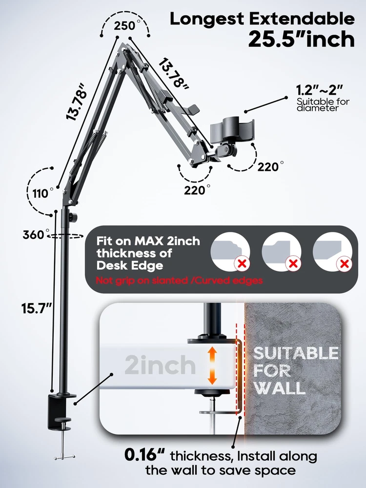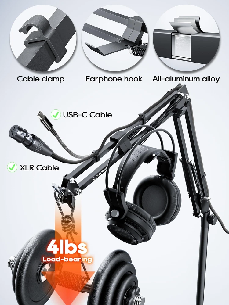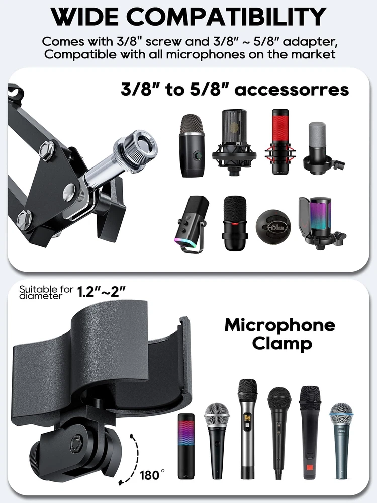 boom arm mic arm mic arm stand microphone arm mic stand desk mic arm 360 boom arm with adapter mic boom arm mic arm desk mount π½πππΌπΏ πΎππππΌπππ½ππππποΌOur Mic Arm compatible with most standard mics with a standard 5/8" or 3/8" threading.C STAND/BOOM ARM πΌππ πΌππππ πππ ππΌππ πΎπΌπ π½π πΌπΎππππππΏοΌThe bottom of this Boom Arm is 15.7 inches higher than the ordinary stands, and it is more free to adjust the angle and height. It can be adjusted to any angle you want, better for Live Streaming, Gaming, Podcasting, Vlog Shooting, Online Class, etc,. πππΌπΎπ-ππΌππππ πΎπΌπ½πππ ππππΏππ: This microphone stand is equipped with 4 cable holders to hold the cables on the stand. ππππ ππππππππ πππποΌA headphone hook is included, no need to buy a headphone stand anymore. Let your money really be spent wisely. πππππΏπ πππππΏ πππππΎπππποΌThis microphone arm comes with a sturdy C-clip for a secure fit on your desk. The stand can be easily folded to carry and store. πππ-πππΌπ πΌππππ-ππΌππ ππππππΎπ: If there is any problem, please contact us at any time, just replace it but not repair it.
