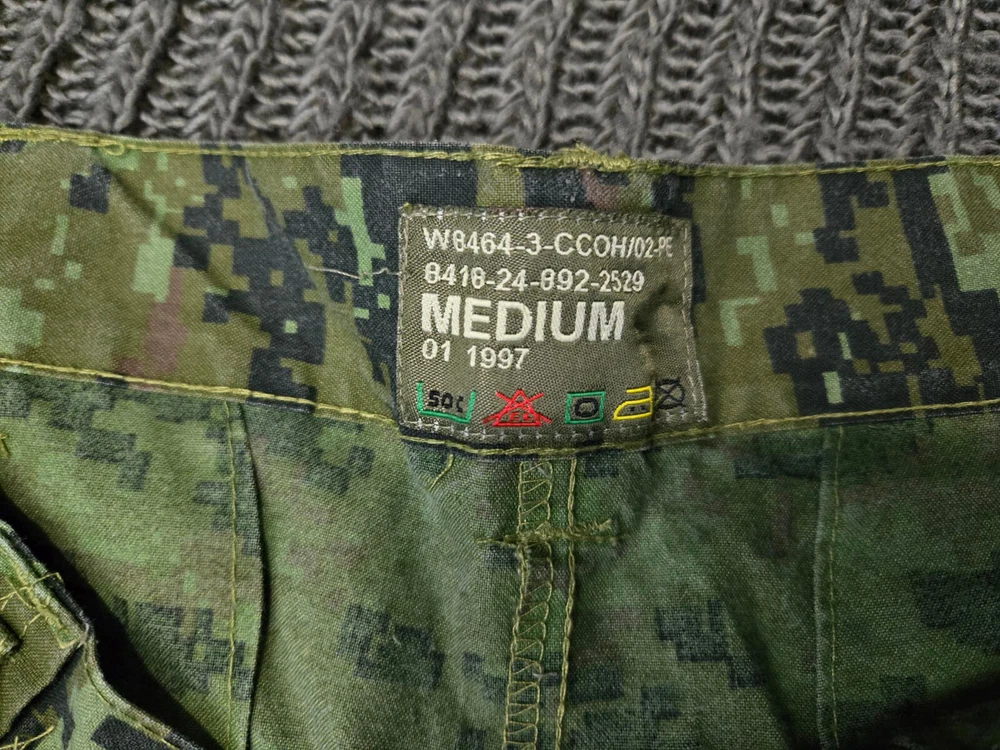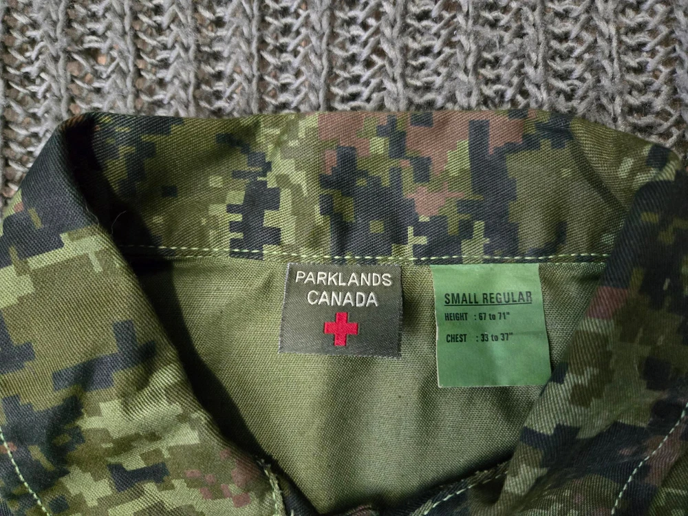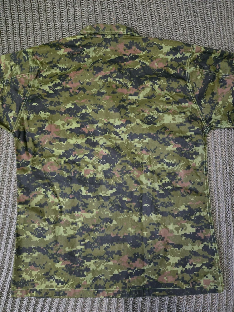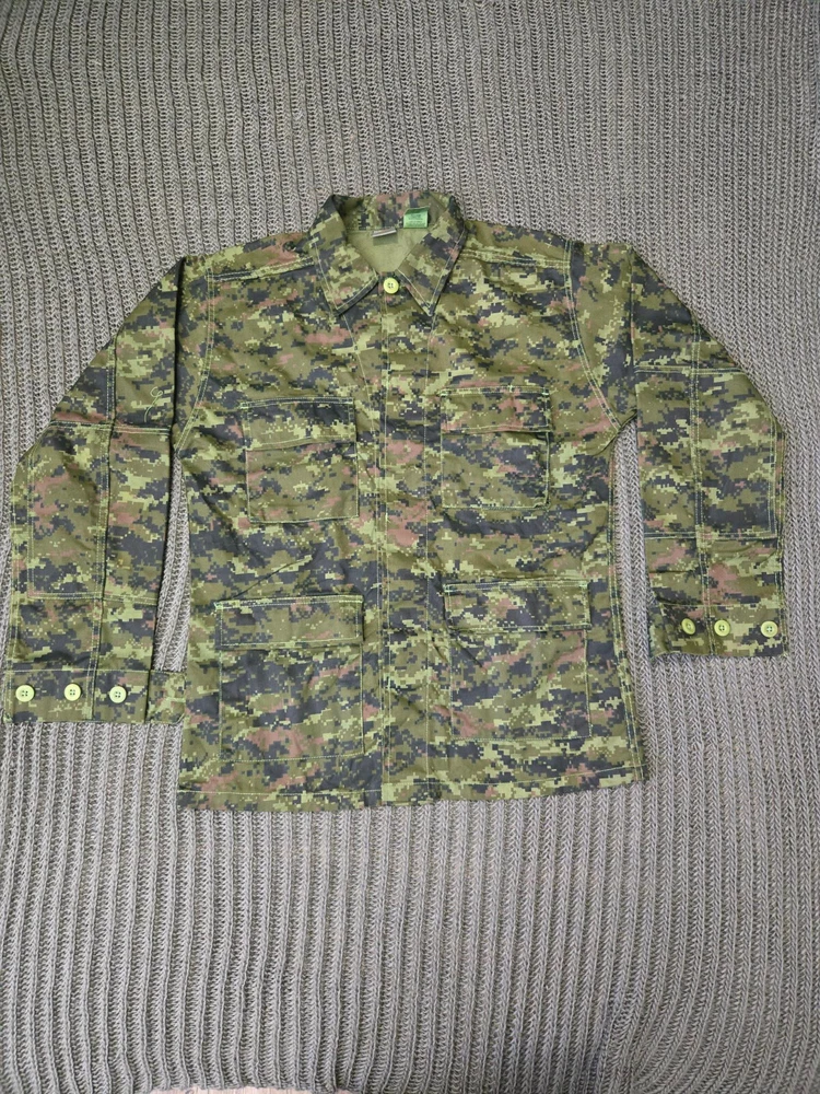 a modern military Uniform patterned after the Canadian 4 pocket CAFCU. printed in a digital woodland camo. This package includes a Jacket, Size Small-Regular, and a Pair of Trousers, Size Medium-Regular.