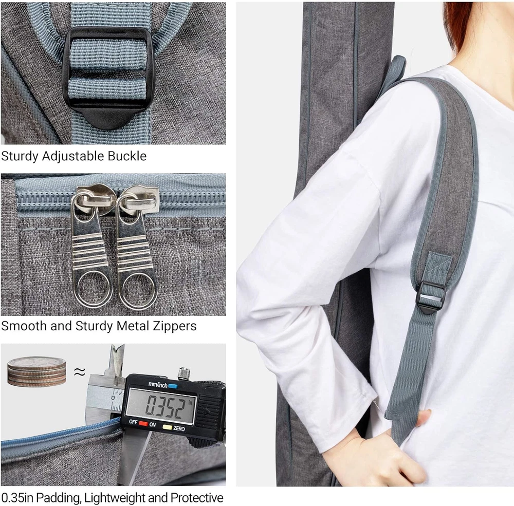 Adjustable Backpack-Style Shoulder Straps: Comfortable to carry with padded carry handle and adjustable straps. Thick Padded Lining: Protects gear with 0.35in interior padding throughout. Stylish Design: Grey nylon weave case with blue zippers and contrasting color scheme. Durable Construction: Lightweight yet rugged nylon material with showerproof design. Fits Most Standard Guitars: 41.7 x 15.3 x 2.75 inch dimensions fit most single and double cutaway guitars.