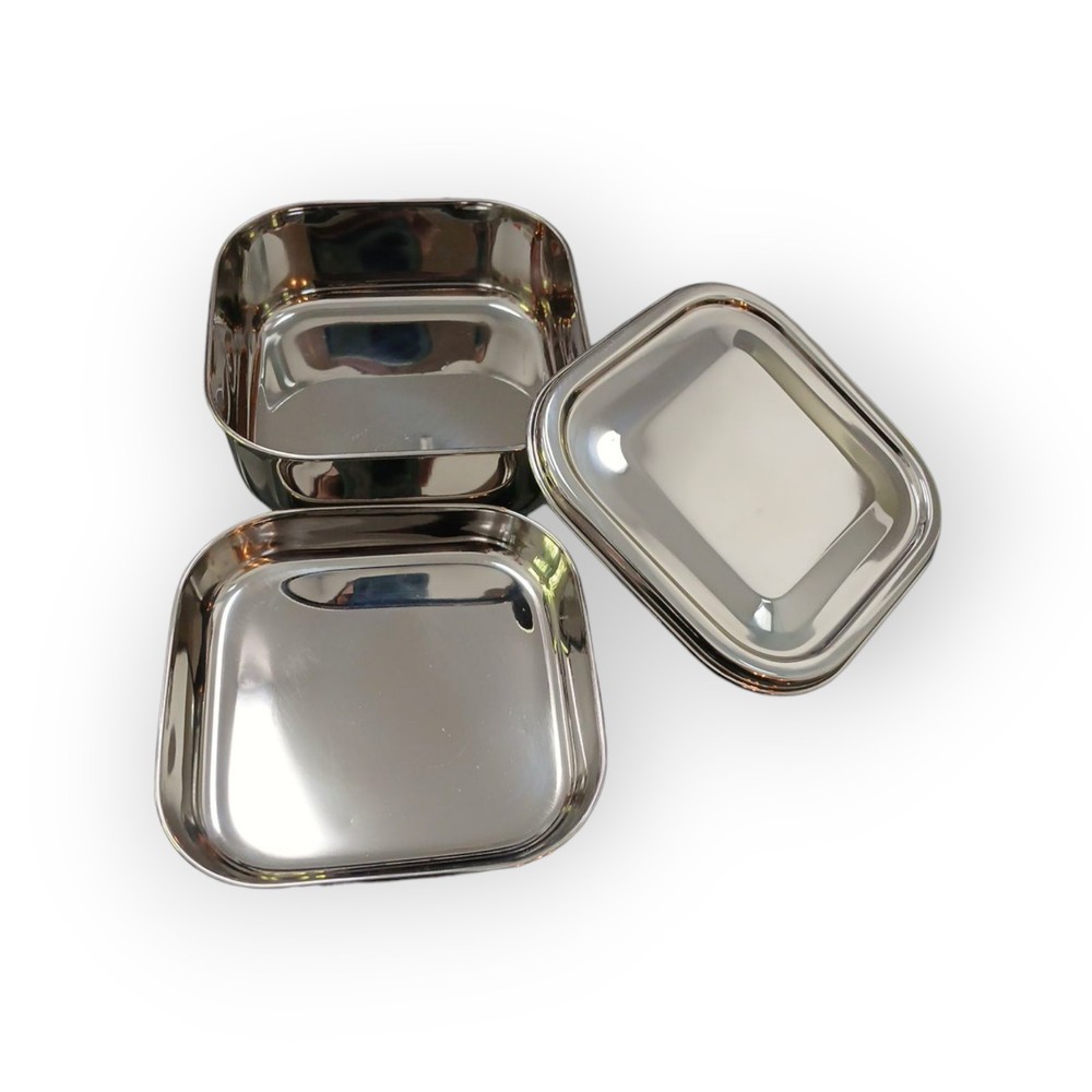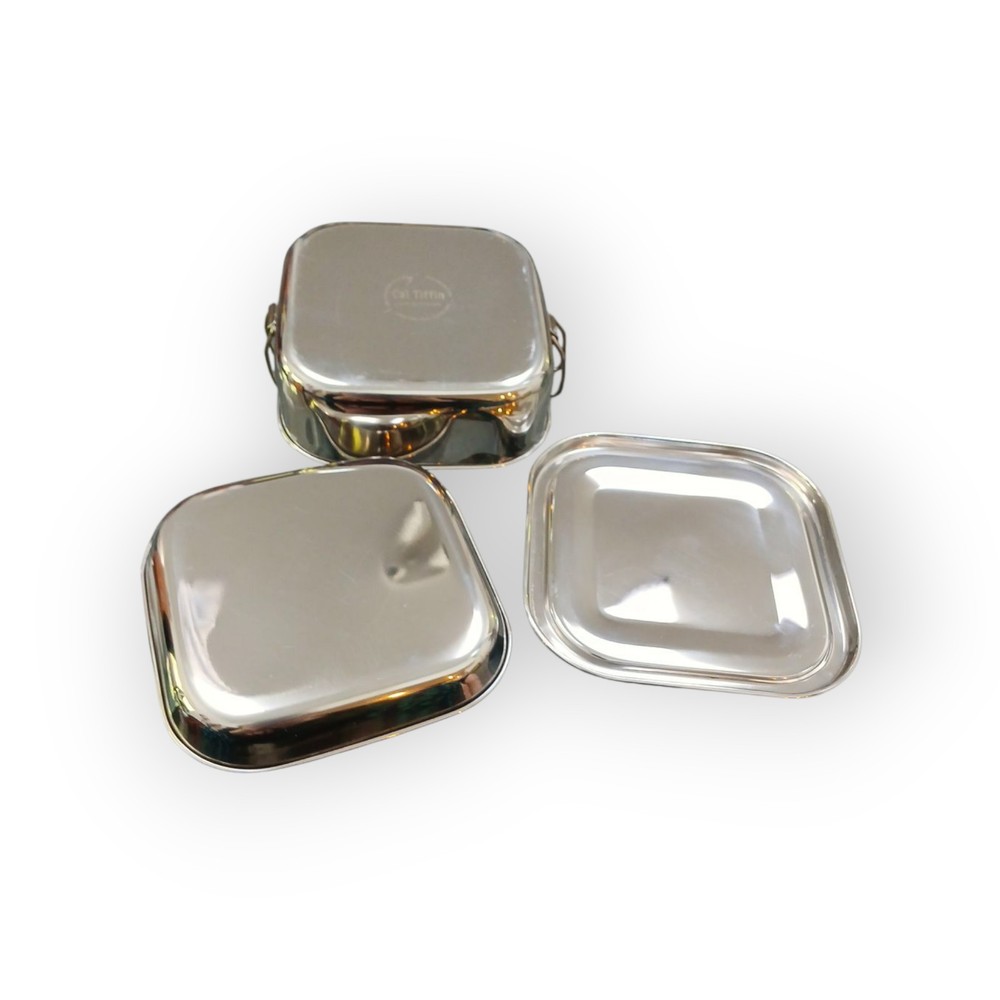 LIKE NEW!! NO DENTS! NO MAJOR SCRATCHES! The CAL TIFFIN Stainless Steel SQUARE Bento Lunchbox is a 25 oz, 2-compartment tiffin box perfect for carrying your favorite meals on-the-go. With a solid stainless steel construction and a sleek silver color, this classic style lunchbox is both durable and stylish. The set includes a lid, main compartment, and upper tray insert, making it easy to enjoy your food wherever you are. Made by CAL Tiffin, this tiffin box is not only reusable but also easy to clean and dishwasher safe, making it a convenient and practical choice for everyday use.