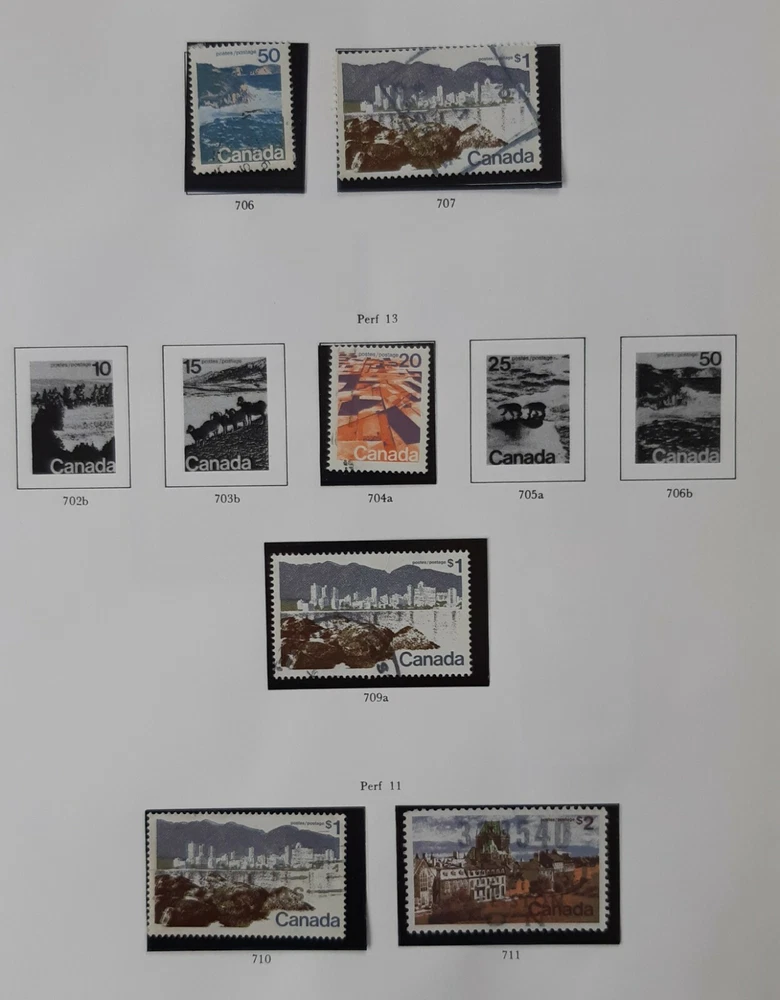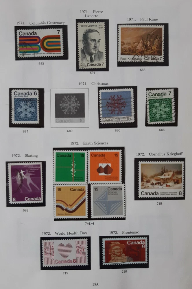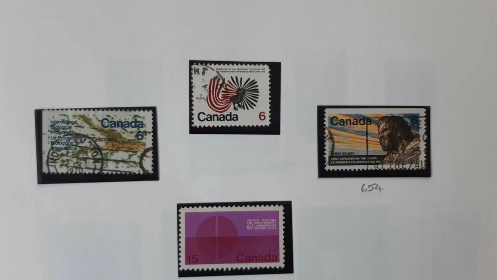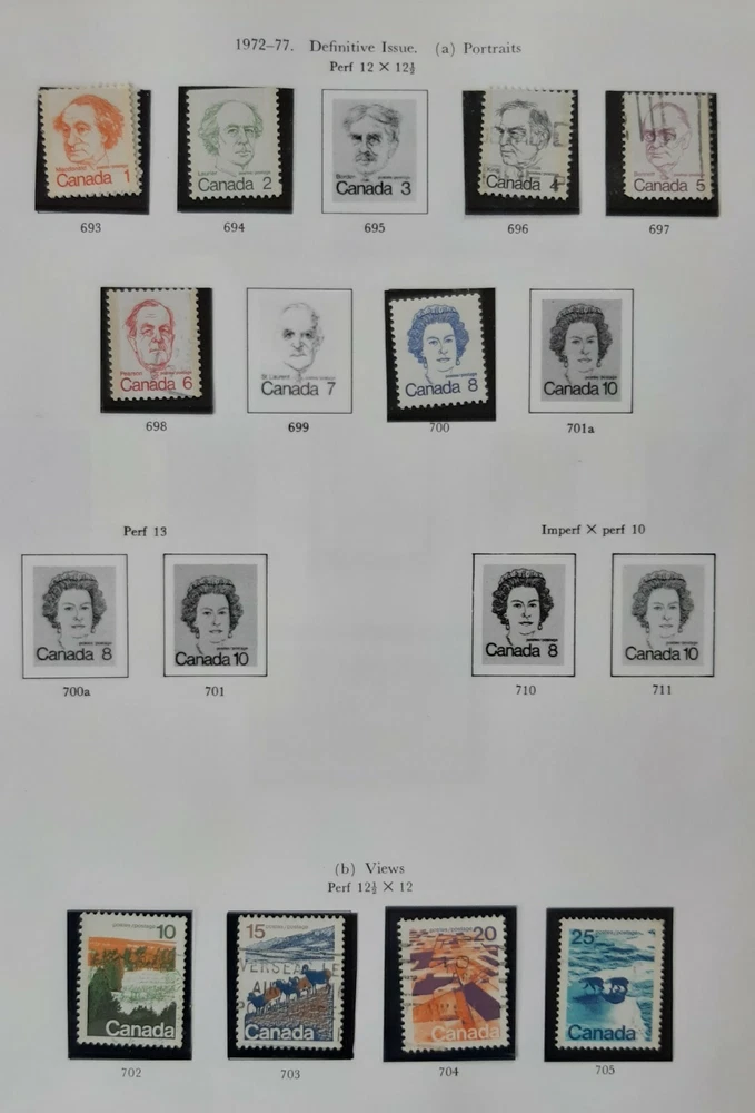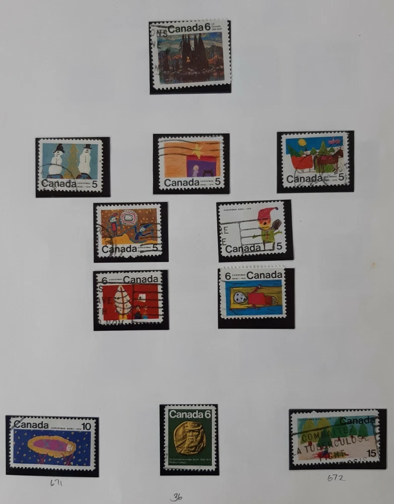 CANADA 1970 - 1972 Queen Elizabeth II - 6 Album pages. A collection of most of the commemorative issues of1971 & 1972. Pages 1 & 2 - Five commemoratives from 1970, celebrating various anniversaries & including most of the colourful Christmas issue of Children's Drawings. Page 3 - six of the first single issue commemoratives plus the set of 4 depicting The Maple Leaf in Four Seasons. Page 4 - The remaining commemoratives from 1971 plus 3 of the 4 Christmas stamps & the first eight single issue commemoratives of 1972 including the set of four celebrating Earth Sciences. Page 5 - Six of the nine definitive issue depicting Canadian Prime Ministers & QEII; the first four of the Landscape Images commemorative issue. Page 6 - The final (50c) Landscape Image commemorative plus the City Pictures $1 & $2 set. All mounted in Hawid mounts and all used. All displayed on pages from an illustrated album - see photo. I am selling a stamp collection that I started in my youth and which my father took over during his retirement. We always concentrated on Great Britain plus Jersey, Guernsey and the Isle of Man, Ireland and the major Commonwealth countries of Canada, Australia and New Zealand. The great majority of stamps are pages from albums, are within Hawid mounts and are in date and issue order, based upon Stanley Gibbons catalogues. If you have an interest in any of these countries and you are unable to locate the stamps you are seeking on my eBay pages, please feel free to contact me and make an enquiry. The dates of the individual collections are as follows: GB from 1935 – 1982 Guernsey, Jersey & Isle of Man 1953 – early 1980s Canada 1870 – 1983 Australia 1913 – 1977 New Zealand 1891-1980 Ireland 1923-1970 There is a very good chance that for these countries and between these dates I may well have the stamps you are looking for as each collection is quite comprehensive. · Album pages will be posted in a new card backed envelope. · All orders will be posted via 2 nd class; orders over £20 will be sent 2 nd class signed for. · Feedback is important to us both; if you are happy please leave a positive review as I will for you as a buyer! · Please DO let me know immediately if there is any problem; my promise to you is that I will sort it out. Thank you, John