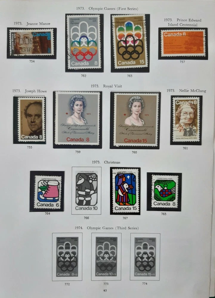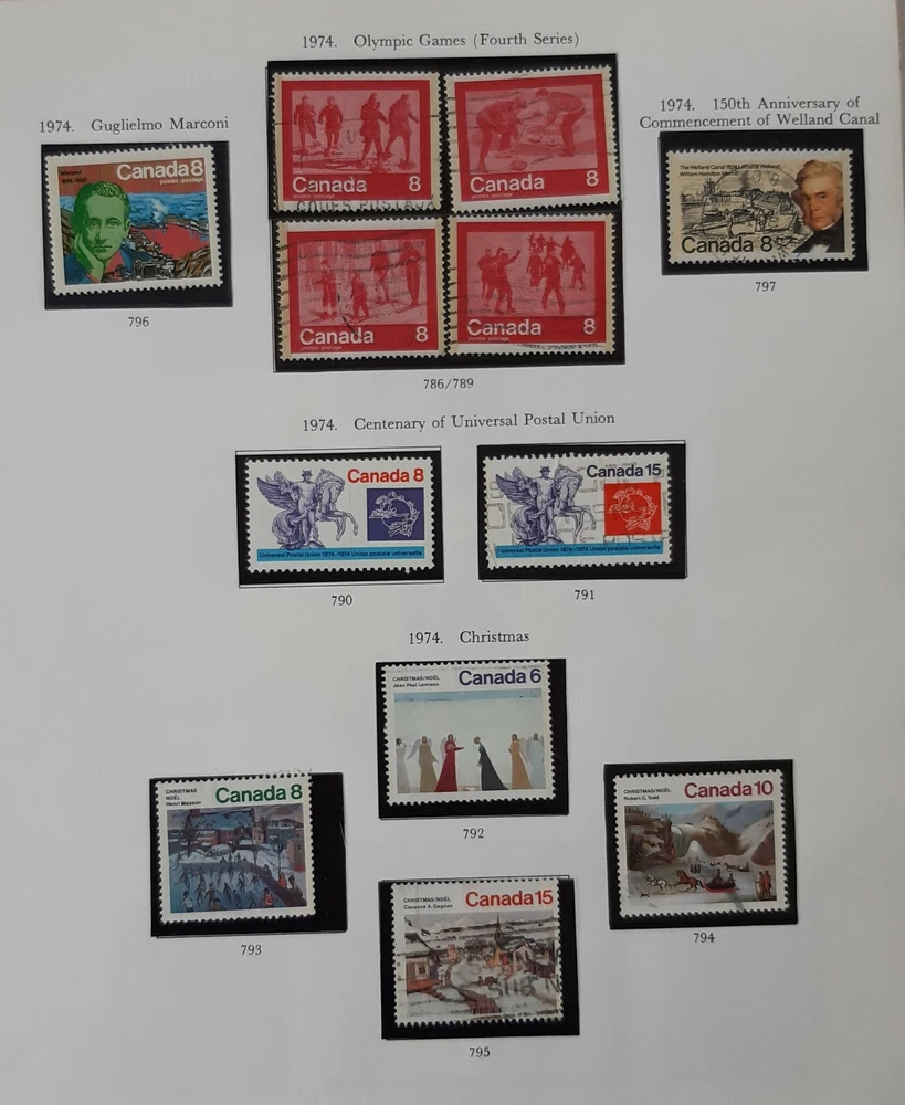 CANADA 1973 - 74 Queen Elizabeth II - 4 Album pages commemorative issues. A collection of most of the 1973 - 74 commemorative issues including the 1974 Montreal Olympics. Page 1 - Three stamps for the Centenary of the Royal Canadian Mounted Police, 1973. Page 2 - The first issue of the Olympic Games (2 stamps), the Royal Visit of 1973 and four single commemoratives plus 3 of the 4 Christmas issue. Page 3 - The four stamps from the second issue of Olympic Games plus five individual commemorative issues. Page 4 - The four stamps from the fourth issue of Olympic Games plus four other commemoratives and the four from the 1974 Christmas issue. All mounted in Hawid mounts and all used. All displayed on pages from an illustrated album - see photo. I am selling a stamp collection that I started in my youth and which my father took over during his retirement. We always concentrated on Great Britain plus Jersey, Guernsey and the Isle of Man, Ireland and the major Commonwealth countries of Canada, Australia and New Zealand. The great majority of stamps are pages from albums, are within Hawid mounts and are in date and issue order, based upon Stanley Gibbons catalogues. If you have an interest in any of these countries and you are unable to locate the stamps you are seeking on my eBay pages, please feel free to contact me and make an enquiry. The dates of the individual collections are as follows: GB from 1935 – 1982 Guernsey, Jersey & Isle of Man 1953 – early 1980s Canada 1870 – 1983 Australia 1913 – 1977 New Zealand 1891-1980 Ireland 1923-1970 There is a very good chance that for these countries and between these dates I may well have the stamps you are looking for as each collection is quite comprehensive. · Album pages will be posted in a new card backed envelope. · All orders will be posted via 2 nd class; orders over £20 will be sent 2 nd class signed for. · Feedback is important to us both; if you are happy please leave a positive review as I will for you as a buyer! · Please DO let me know immediately if there is any problem; my promise to you is that I will sort it out. Thank you, John