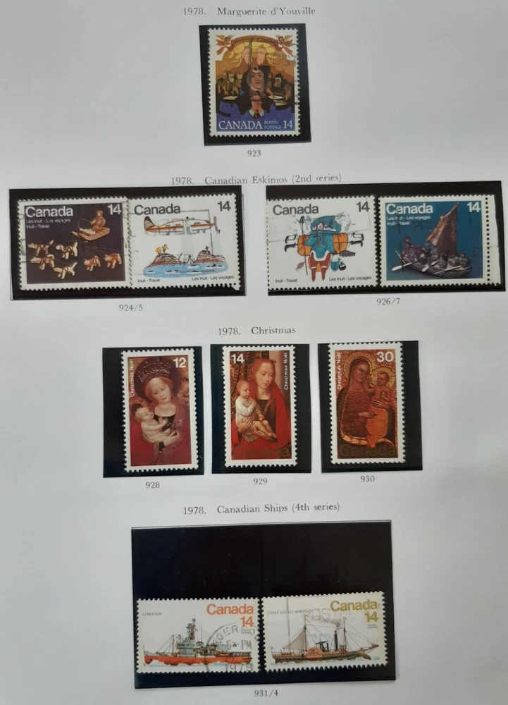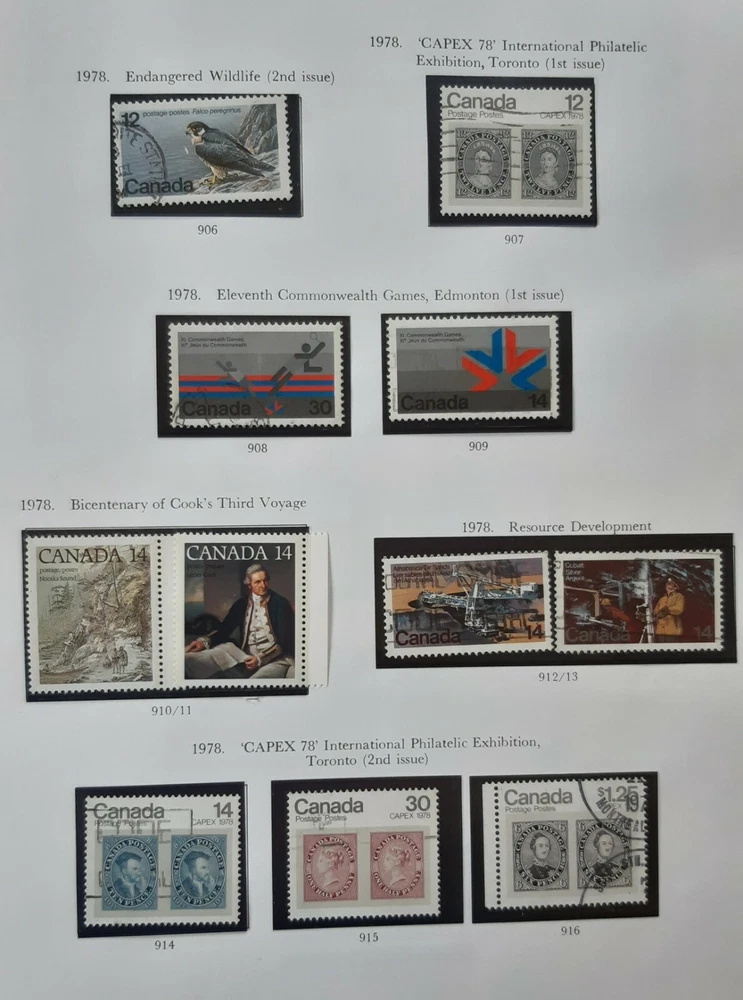 CANADA 1978 Queen Elizabeth II - Commemorative Issues 3 Album pages. A collection of all except one of the commemorative issues of 1978. Page 1 - Six new Commemoratives with two single issues plus Edmonton's Commonwealth Games (1st series), Bicentenary of Cook's Third Voyage, Resource Development& Philatelic Exhibition. Page 2 - A special issue of the Philatelic Exhibition plus Edmonton's Commonwealth Games (2nd series). Page 3 - Canadian Eskimos/Inuit (2nd series), the Christams issue plus Canadian Ships (4th series)' All mounted in Hawid mounts and all used. All displayed on pages from an illustrated album - see photo. I am selling a stamp collection that I started in my youth and which my father took over during his retirement. We always concentrated on Great Britain plus Jersey, Guernsey and the Isle of Man, Ireland and the major Commonwealth countries of Canada, Australia and New Zealand. The great majority of stamps are pages from albums, are within Hawid mounts and are in date and issue order, based upon Stanley Gibbons catalogues. If you have an interest in any of these countries and you are unable to locate the stamps you are seeking on my eBay pages, please feel free to contact me and make an enquiry. The dates of the individual collections are as follows: GB from 1935 – 1982 Guernsey, Jersey & Isle of Man 1953 – early 1980s Canada 1870 – 1983 Australia 1913 – 1977 New Zealand 1891-1980 Ireland 1923-1970 There is a very good chance that for these countries and between these dates I may well have the stamps you are looking for as each collection is quite comprehensive. · Album pages will be posted in a new card backed envelope. · All orders will be posted via 2 nd class; orders over £20 will be sent 2 nd class signed for. · Feedback is important to us both; if you are happy please leave a positive review as I will for you as a buyer! · Please DO let me know immediately if there is any problem; my promise to you is that I will sort it out. Thank you, John