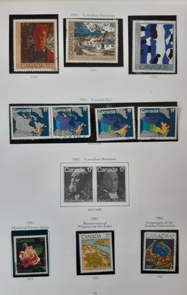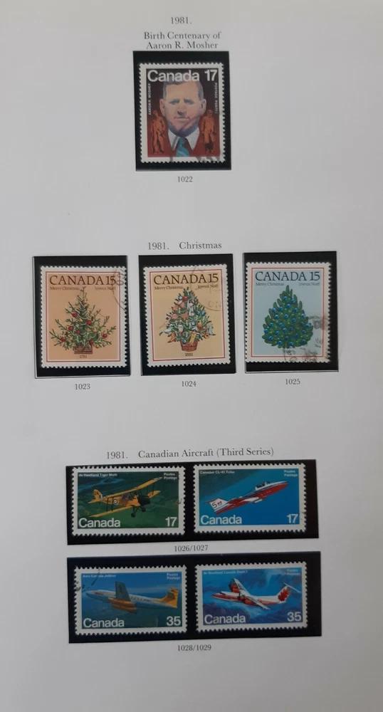 CANADA 1981 Queen Elizabeth II - Commemorative Issues 4 Album pages. A collection of most of the commemorative issues of 1981 plus some new definitives. Page 1 - Three new Commemoratives Feminists (a set of 4) & Endangered Wildlife (fifth series). Page 2 - Five new commemoratives including, 3 being single issues plus sets of Canadian Paintings (3) and Canada Day. Page 3 - Three commemorative sets including the Christmas issue & Canadian Aircraft (third series). Page 4 - A variety of five new definitive stamps. All mounted in Hawid mounts and all used. All displayed on pages from an illustrated album - see photo. I am selling a stamp collection that I started in my youth and which my father took over during his retirement. We always concentrated on Great Britain plus Jersey, Guernsey and the Isle of Man, Ireland and the major Commonwealth countries of Canada, Australia and New Zealand. The great majority of stamps are pages from albums, are within Hawid mounts and are in date and issue order, based upon Stanley Gibbons catalogues. If you have an interest in any of these countries and you are unable to locate the stamps you are seeking on my eBay pages, please feel free to contact me and make an enquiry. The dates of the individual collections are as follows: GB from 1935 – 1982 Guernsey, Jersey & Isle of Man 1953 – early 1980s Canada 1870 – 1983 Australia 1913 – 1977 New Zealand 1891-1980 Ireland 1923-1970 There is a very good chance that for these countries and between these dates I may well have the stamps you are looking for as each collection is quite comprehensive. · Album pages will be posted in a new card backed envelope. · All orders will be posted via 2 nd class; orders over £20 will be sent 2 nd class signed for. · Feedback is important to us both; if you are happy please leave a positive review as I will for you as a buyer! · Please DO let me know immediately if there is any problem; my promise to you is that I will sort it out. Thank you, John