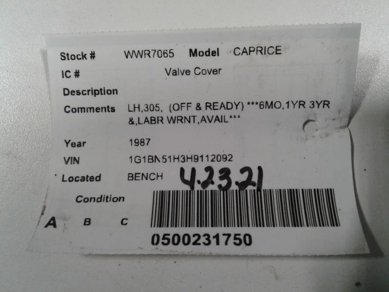 Powered by Frooition All Items See our eBay store for more great items >> Shop Categories ABS Anti-Lock Brake Part Other Aftermarket Stereos Air Bags Amplifiers Anti-Lock Brake Part Automobiles Stereos A/V Equipment CD Changers Center Caps + Wheel Covers Chassis Brain Box Coil Packs Computer + Control Modules Distributors Door Mirrors Door Panels DVD Equipment Engines Front Lamps Grilles Headlamp & Front Lamps Heat A/C Control Heater Motor/Blower Starters Interior Switches Interior Switch / Controls Keyless Entry FOB Owners Manual's Speedometers Tail Lights Transmission Wheels + Tires Alternators Fuel Pumps Window Regulators & Controls Steering Pumps Wiper Motors Compressors INFO/GPS/TV SCREENS Radiator Windshield Washer Bottles Condenser Shifters Windows & Sunroof Turbo Superchargers Glass Doors Air Cleaner Box Spindles Drive Shafts CAPRICE 1987 Valve Cover 917875 Item Description This listing is for the item pictured. It is ready to ship and comes with a 90 day warranty! eBay compatibility may be incorrect. See below for fitment information and any notes pertaining to this specific part. Feel free to contact us if you have any questions. Thanks for looking! Donor Vehicle: Year: 1987 Model: CAPRICE Stock #: WR7065 Mileage: 41000 Notes: LH,305, OFF READY 6MO,1YR 3Y This part will only fit: For more parts from this vehicle, CLICK HERE . About Us About Us Payment Shipping Terms Returns About Us We are a family-owned business with over 30 years in the used car parts industry. We're proud to provide excellent quality used auto parts at famously discounted prices! Over time we have grown to 4 locations in Harrison, MI, Lansing, MI, Saint Johns, MI, and Toledo, OH. We are here to serve you Monday thru Friday 8 a.m. to 5 p.m. EST. If you have any concerns or questions, please feel free to message us here on eBay. We will normally get back to you within 12 hours during the work week. Payment Payment We accept Paypal, all major credit cards and cash (if you are picking up the item). Payment is required within 2 days of winning a listing. If payment is not made after 2 days, an unpaid item case will be opened. Shipping Shipping Most items will ship ground with UPS or USPS. We may use other carriers at our discretion. In some instances, freight orders will require a business address with a loading dock or forklift. A good working phone number is required for all orders. Local pickup is also an option on any order. Our 4 locations are open Monday thru Friday from 8 a.m. to 5 p.m. EST. Please check with us before driving out to make sure we have the part ready at the location nearest to you. Terms Terms Most items include a 90-day warranty (unless otherwise indicated). This coverage is included on all new or used parts unless otherwise stated in the listing or on the front of the invoice. This warranty is non-transferable. Labor is not covered under any circumstance unless a separate labor warranty is purchased. Extended warranties are also available. Please see our website for complete details and exclusions. Returns Returns We allow 60 days for returns. If you ordered the incorrect part or simply do not need it, you are responsible for the origin and return shipping. Helpful Links Add to Favorite Sellers Sign up to Newsletter View Feedback Contact Seller Visit seller's eBay Shop About Seller Page More Items! View more great items PUSH BUTTON IGNITION SWITCH 2015-2016 CHRYSLER 300 WORKS GREAT! $107.09 Wheel 18x8 Alloy 8 Spoke Fits 14-17 INFINITI QX50 1615364 $224.99 Passenger Right Headlight Fits 04-06 MDX 1623916 $89.99 Passenger Right Headlight Fits 07-09 ASPEN 1610956 $84.99 Powered by Frooition Frooition | No-js Template | eBay design, eBay store design, eBay shop design, eBay template design, eBay listing design (ver:froo_no_js) This listing is currently undergoing maintenance, we apologise for any inconvenience caused.