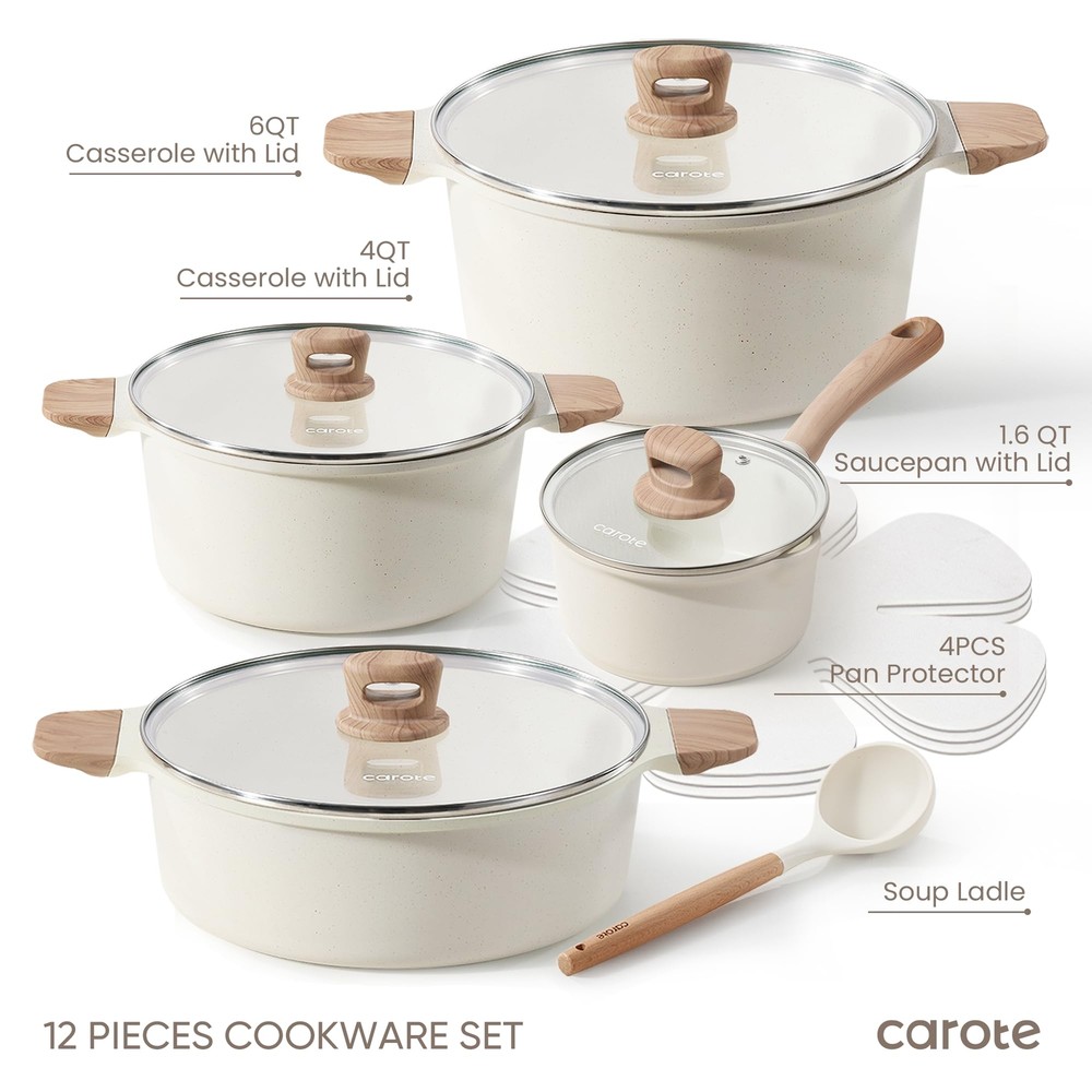 CAROTE 12 Pcs Pots and Pans Set Nonstick, White Granite Induction Time-saving Cleaning: Enjoy effortless cooking and cleaning with exceptional performance and ultra-nonstick coating. Even Heating: Even&rapid heat delivery without hot spots so food cooks the same everywhere on the pan while boiling, simmering, reheating. Cook Healthier:Our cookware sets are free of PFOA, PFOS, and the other harmful chemicals. You can enjoy your cooking on carote cookware safely & easily. Lasting performance: The reinforced die-cast aluminum construction of this kitchen pots and pans set make it resistant to wear and tear, allowing it to withstand frequent usage without compromising its performance. Shipping We offer FREE shipping on all orders! We ship within Three business days of payment, usually sooner. We use a selection of shipping services such as UPS, FedEx, USPS etc. We only ship to the lower 48 states, no APO/FPO addresses or PO Boxes allowed. Local pickups and combined shipping options are not provided at this time. Return You can return a product for up to 30 days from the date you purchased it. Any product you return must be in the same condition you received it and in the original packaging. Please keep the receipt. Payment We accept payment by any of the following methods: PayPal & Credit Cards Thrugh Ebay Please pay as soon as possible after winning an auction, as that will allow us to post your item to you sooner! Feedback Customer satisfaction is very important to us. If you have any problem with your order, please contact us and we will do our best to make you satisfied. Contact Us If you have any queries, please contact us via ebay. We usually respond within 24 hours on weekdays. Please visit our eBay store to check out other items for sale! Thank you for shopping at our store.